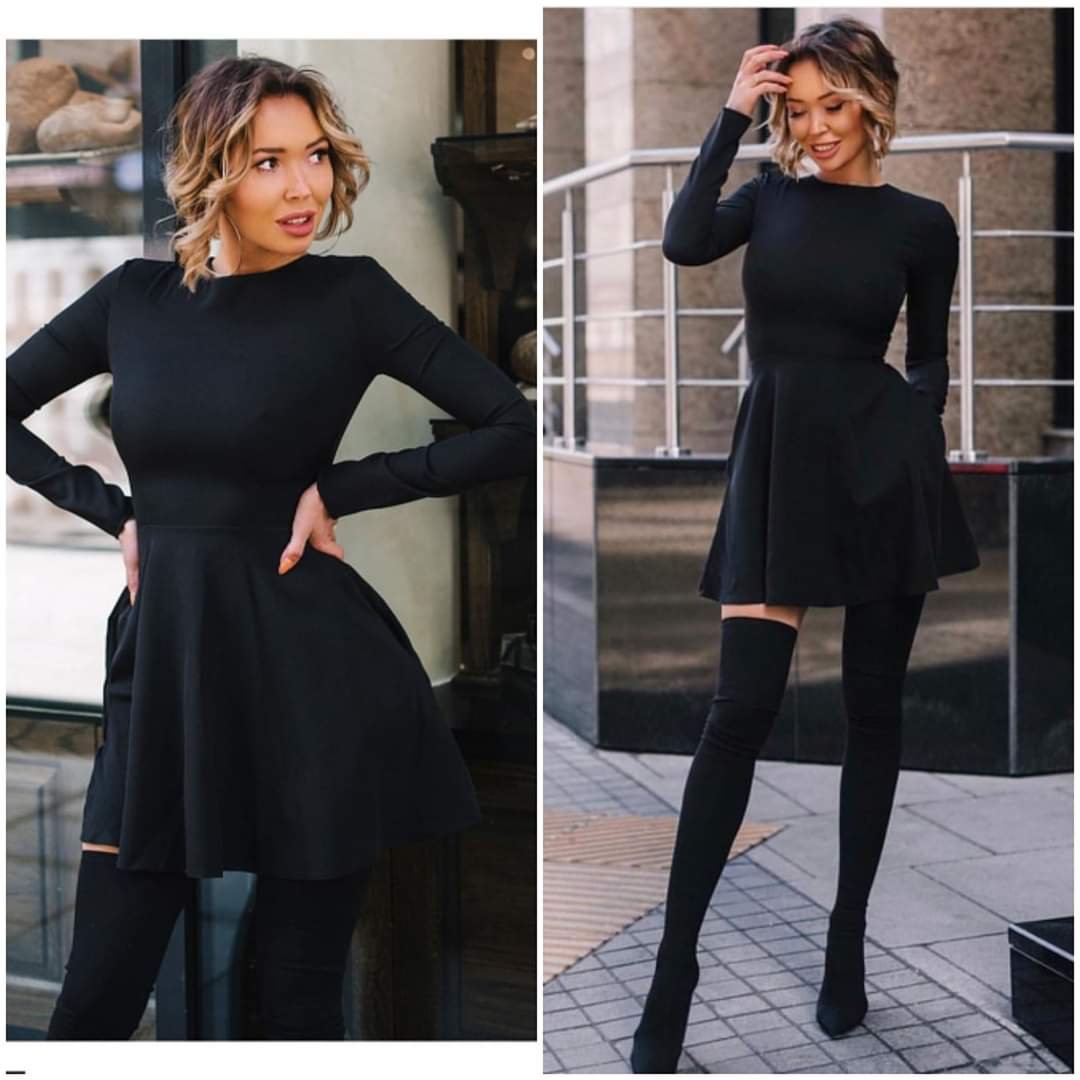 Минималистичен ефект. Тази черна рокля с дълъг ръкав и разкроена пола подчертава талията и внася съвършен баланс между игривост и елегантност. Перфектна за градски вечери, срещи и моменти, в които искаш да си на висота.