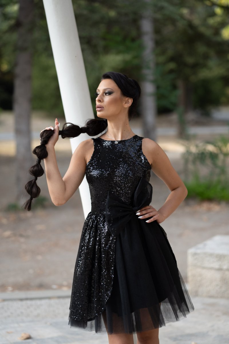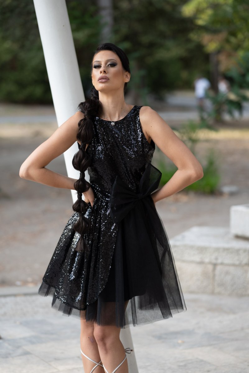 Готова ли си да събереш всички погледи? Тази черна къса рокля с пайети и тюлена панделка е създадена за дами, които обичат смелите модни изяви. Асиметричният дизайн и луксозният блясък подчертават индивидуалността ти. Идеална за празненства, коктейли или всяко събитие, където искаш да си неудържима.