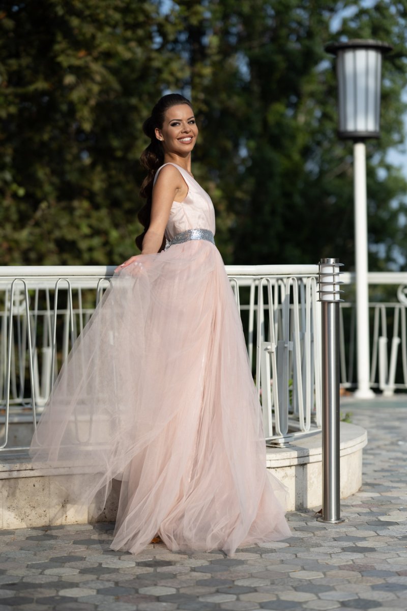 Готова ли си да се почувстваш като в приказка? Тази пудрено розова рокля с разкошна цепка и блестяща сребриста талия е създадена за моменти, които остават завинаги. Ефирната материя обгръща тялото с лекота, а дълбокото деколте добавя доза нежна съблазън. Перфектна за бал, фотосесия или специална вечер, в която искаш да бъдеш запомнена.
