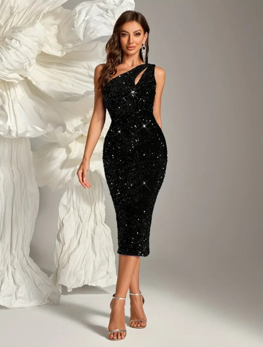 Тази черна рокля с едно рамо, асиметрично деколте и пайети е дефиницията на модерна елегантност с доза дързост. Вталената кройка обгръща тялото ти като луксозна прегръдка, докато изисканата дължина придава класа. С нея си стилна, уверена и абсолютно неудържима.