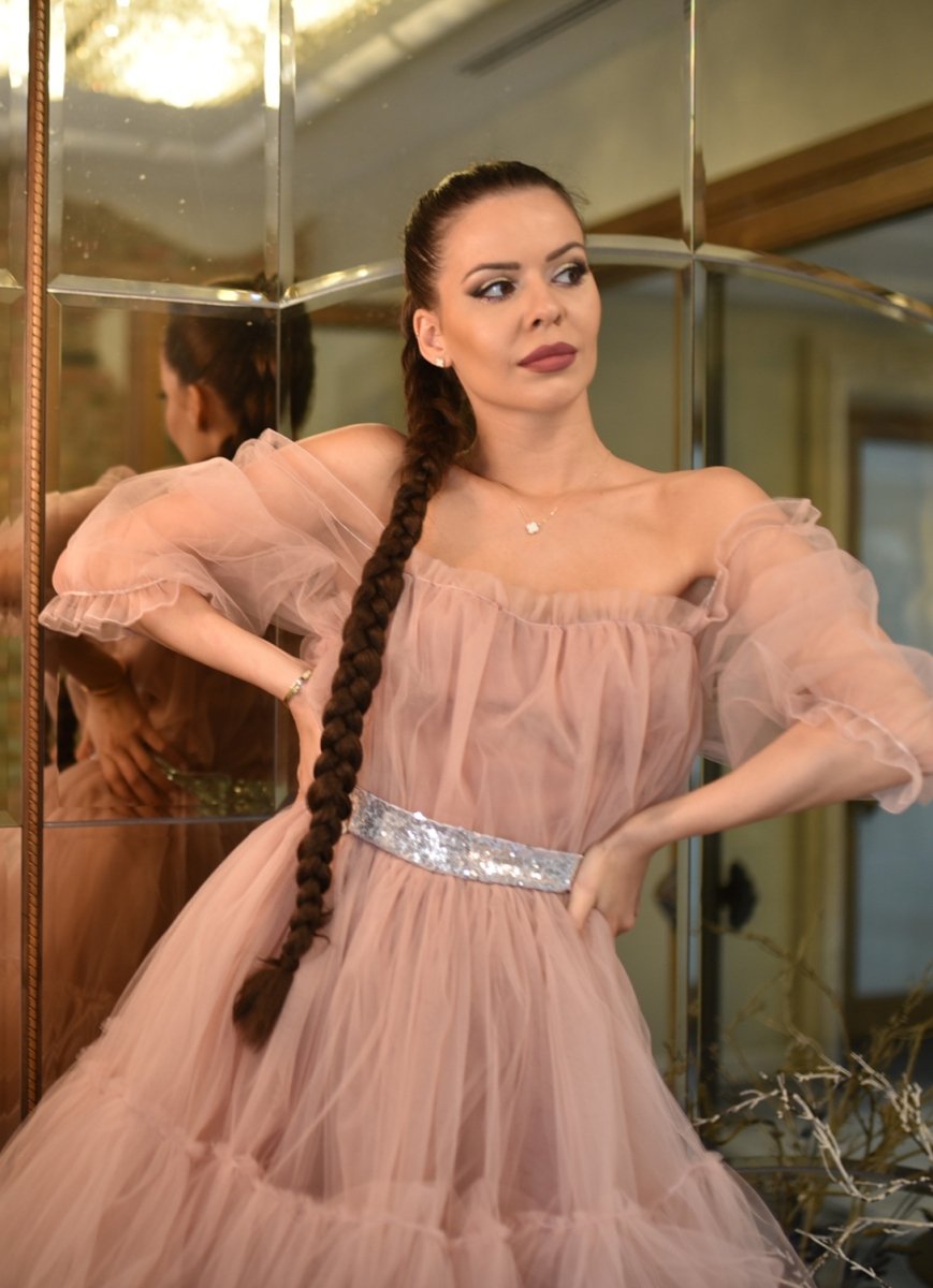 Излъчвай ефирност и грация с тази феерична рокля! Създадена за жени, които обичат да съчетават нежността с елегантността, тази рокля ще те накара да се почувстваш като истинска богиня. Леките пластове тюл създават приказен обем, а сребристият колан в талията придава изтънчен акцент. Падналите рамена и буфан ръкавите допълват женствената визия, докато свободната кройка осигурява максимален комфорт.