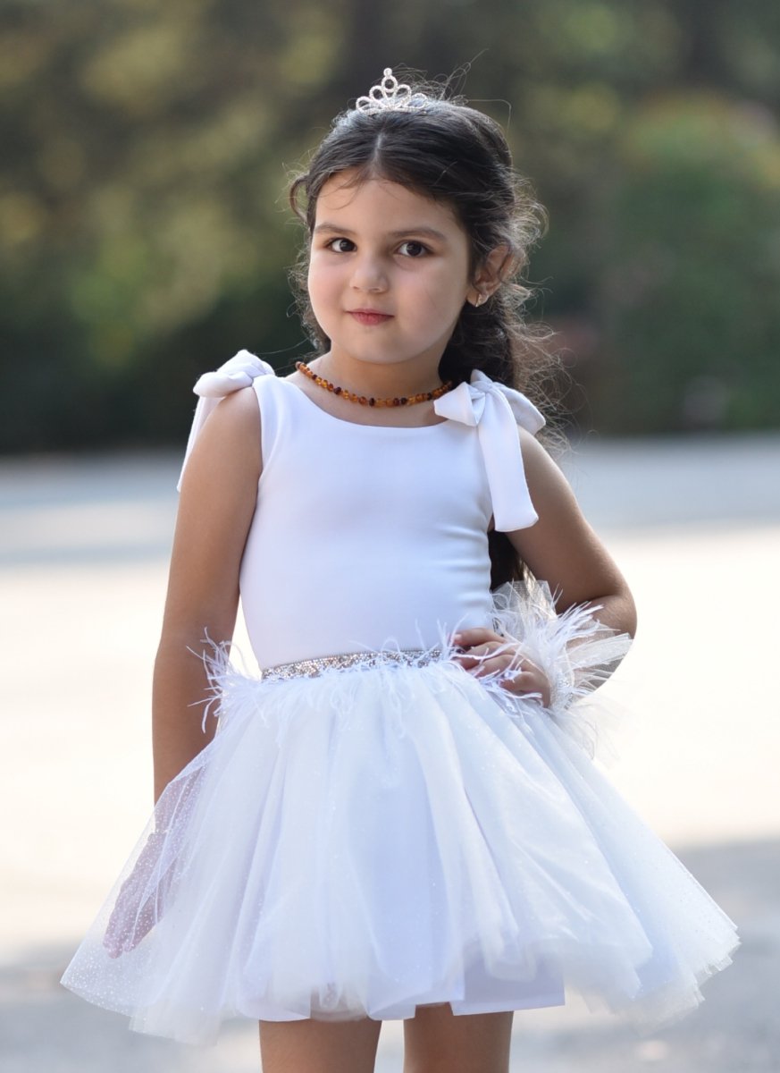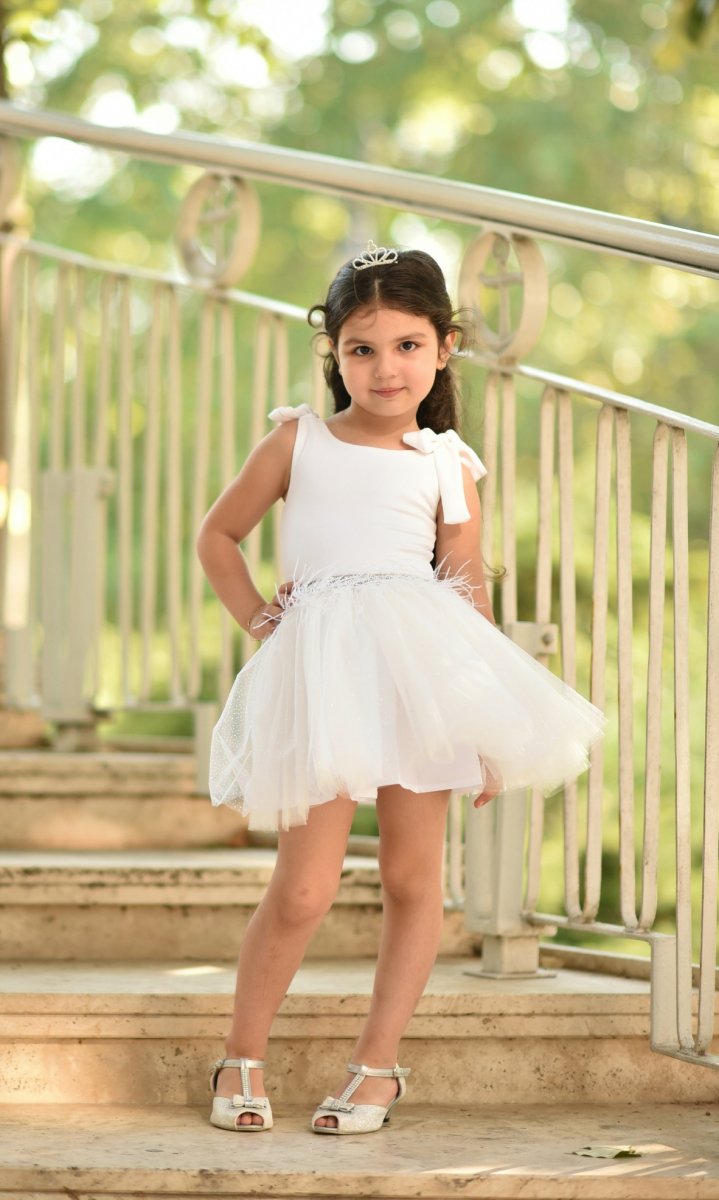 Детска рокля от тюл в бяло с перца
