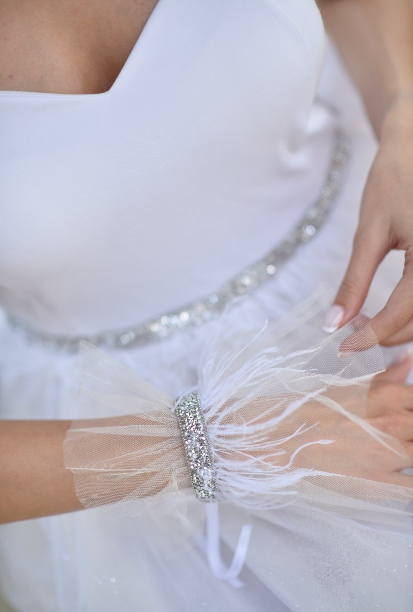 Долната част на роклята е изработена от няколко пласта луксозен тюл, с деликатен блясък, под който има сатенена подплата, а в горната част е мек еластичен плат с тънки презрамки, които можете да завържете на панделки. На гърба на роклите има кръстосани ленти, които могат да се регулират според обиколката на вашият бюст, а към талията има пришито коланче със сребрист акцент и перца.