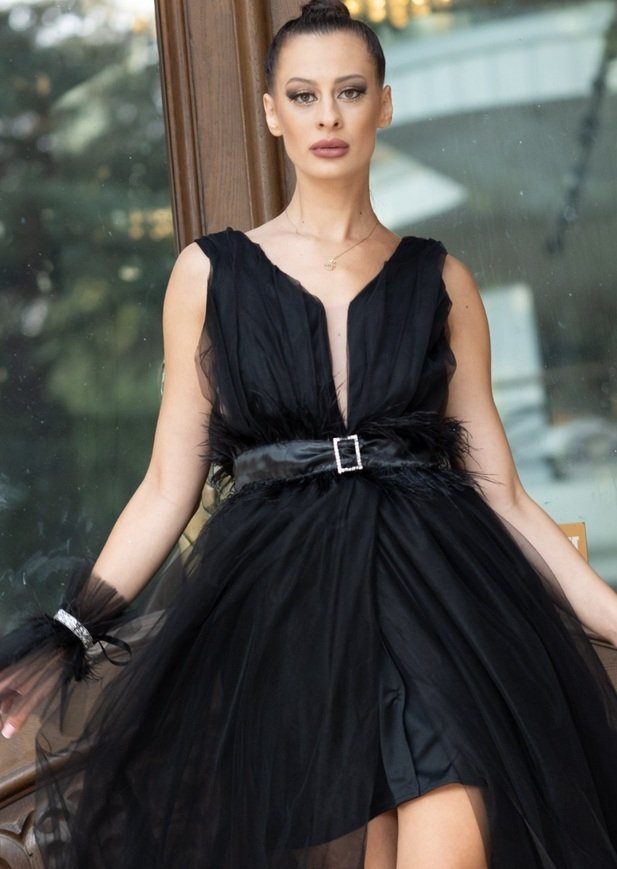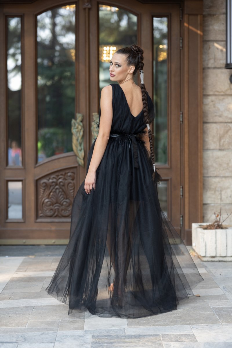 Олицетворение на елегантност и мистерия, тази черна тюлена рокля е за жените, които не просто влизат в стаята – те я завладяват. Леката материя обгръща силуета с финес, а коланът с детайл и пера подчертава талията, добавяйки завършек на визията.