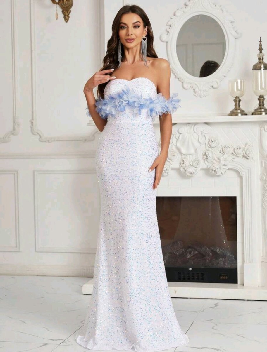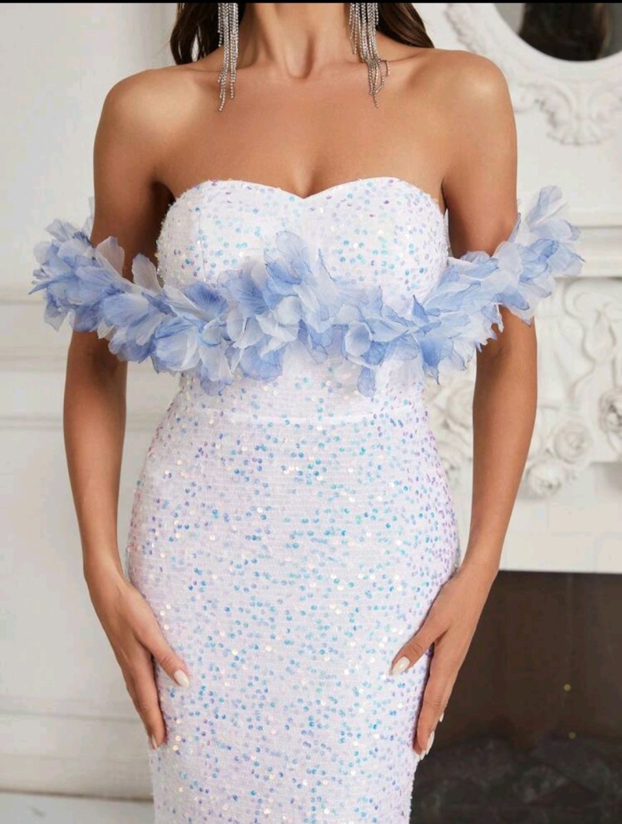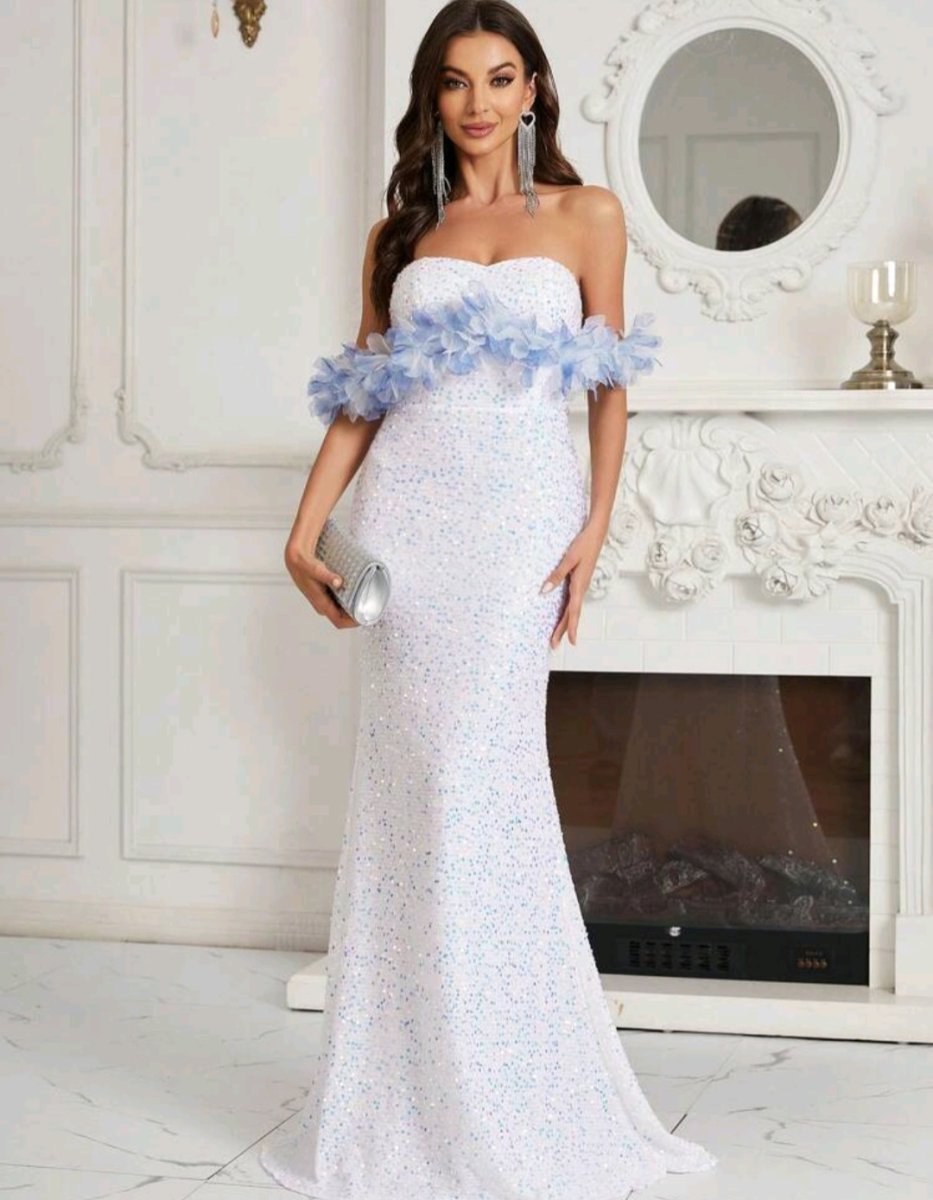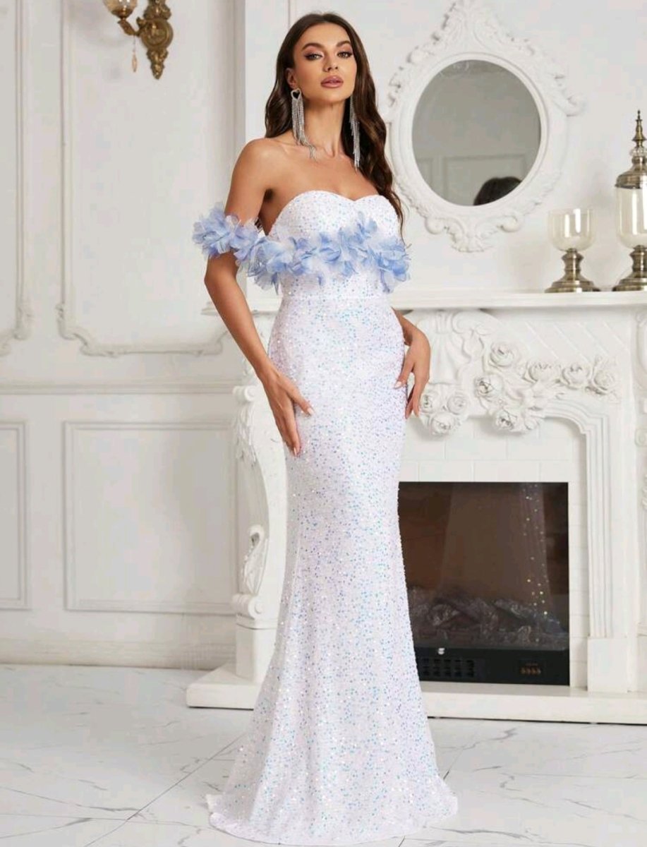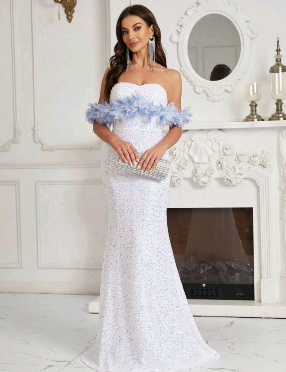Приказна визия с романтичен акцент! Тази дълга бяла рокля съчетава изисканост и ефирност, подчертавайки нежната женственост. Бюстието с паднали рамене е украсено със сини цветя, които придават приказен чар. Пайетите, разпръснати по цялата дължина, създават нежен блясък, докато прилепналият силует тип русалка оформя фигурата с изтънченост.
