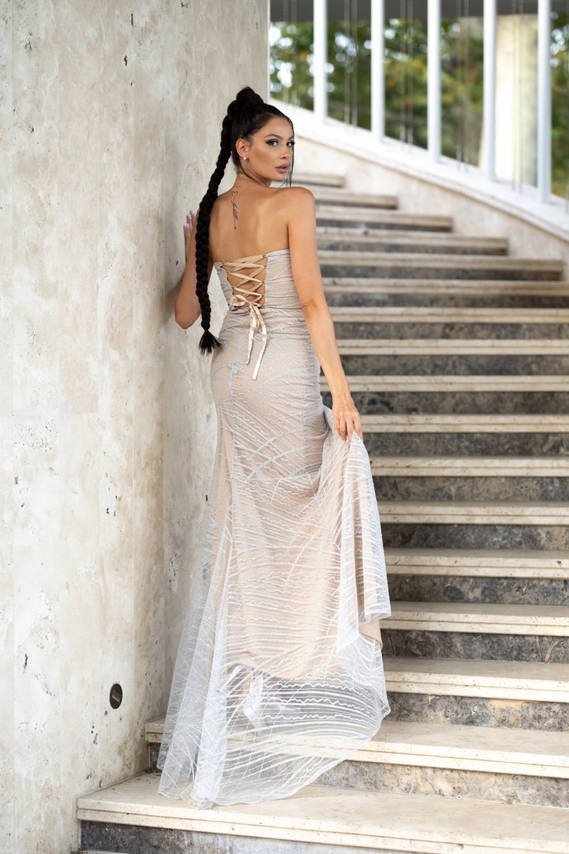 С регулируемо корсетно закопчаване и нежен шлейф, тази рокля е идеалният избор за официални събития и специални поводи. Независимо дали я носиш с високи токчета и блестящи аксесоари, или оставиш блясъкът ѝ да говори сам, ще се чувстваш като истинска кралица на нощта.