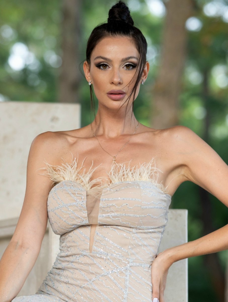 Излъчвай класа и чувственост с тази зашеметяваща дълга рокля, която подчертава женствеността ти. Изработена от изящен плат с фин блясък, роклята обгръща тялото като втора кожа, а корсетният дизайн оформя силуета до съвършенство. Акцентът върху ефирните пера придава доза лукс, а високата цепка разкрива точно толкова, колкото да плениш погледите.