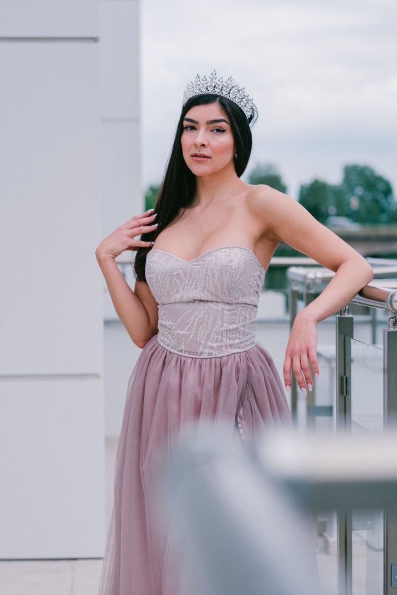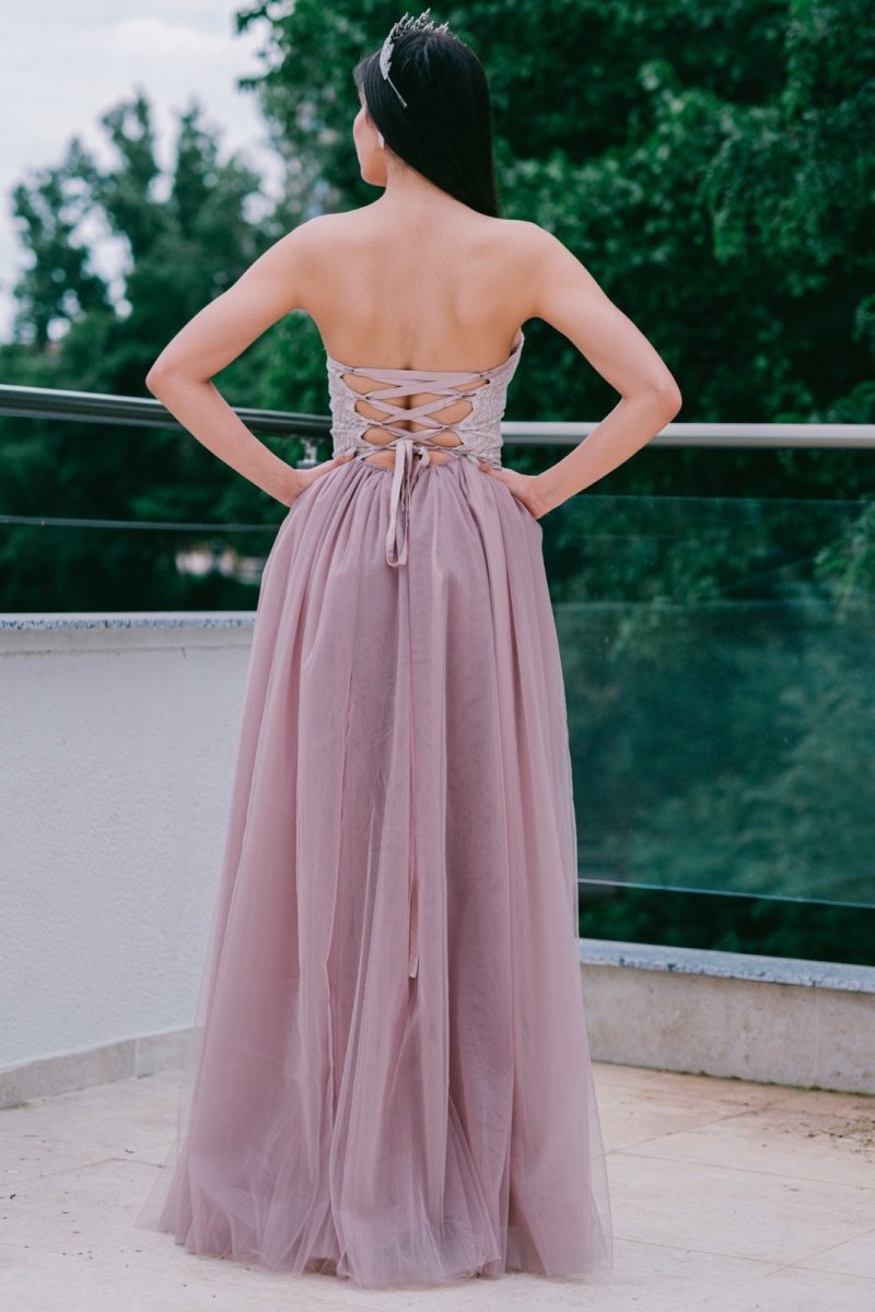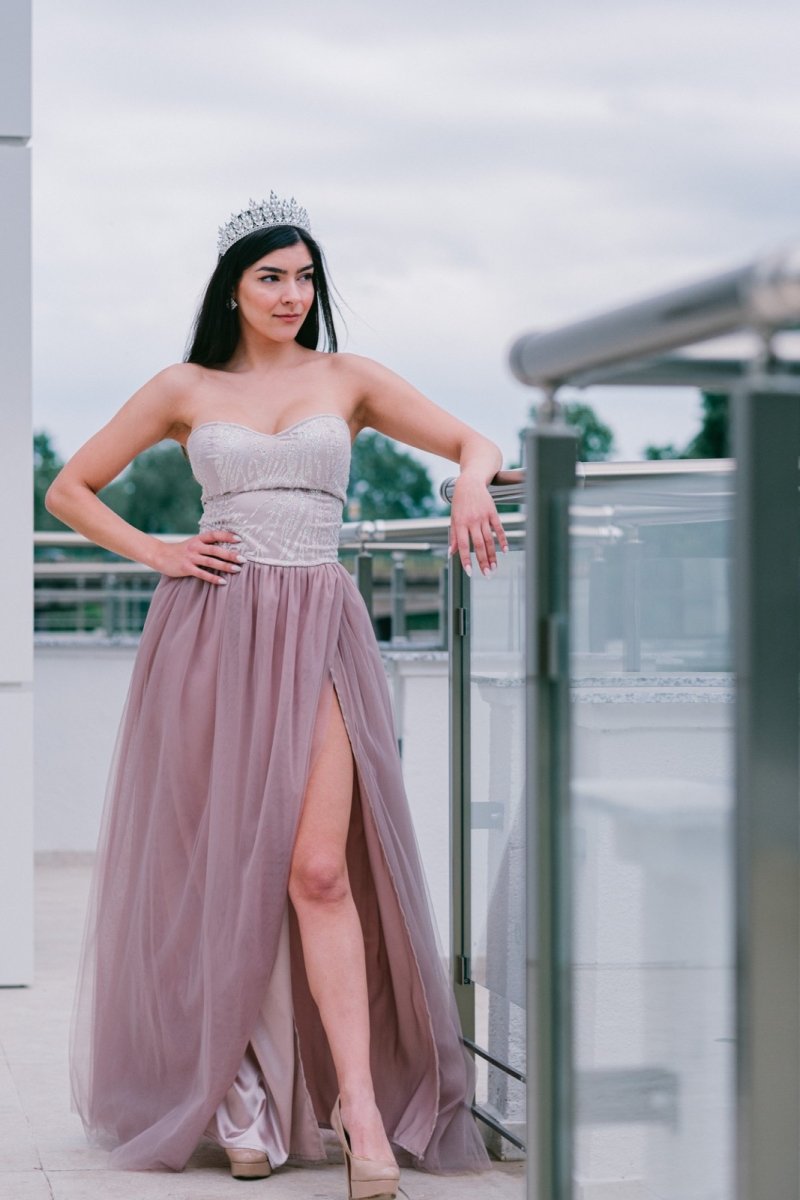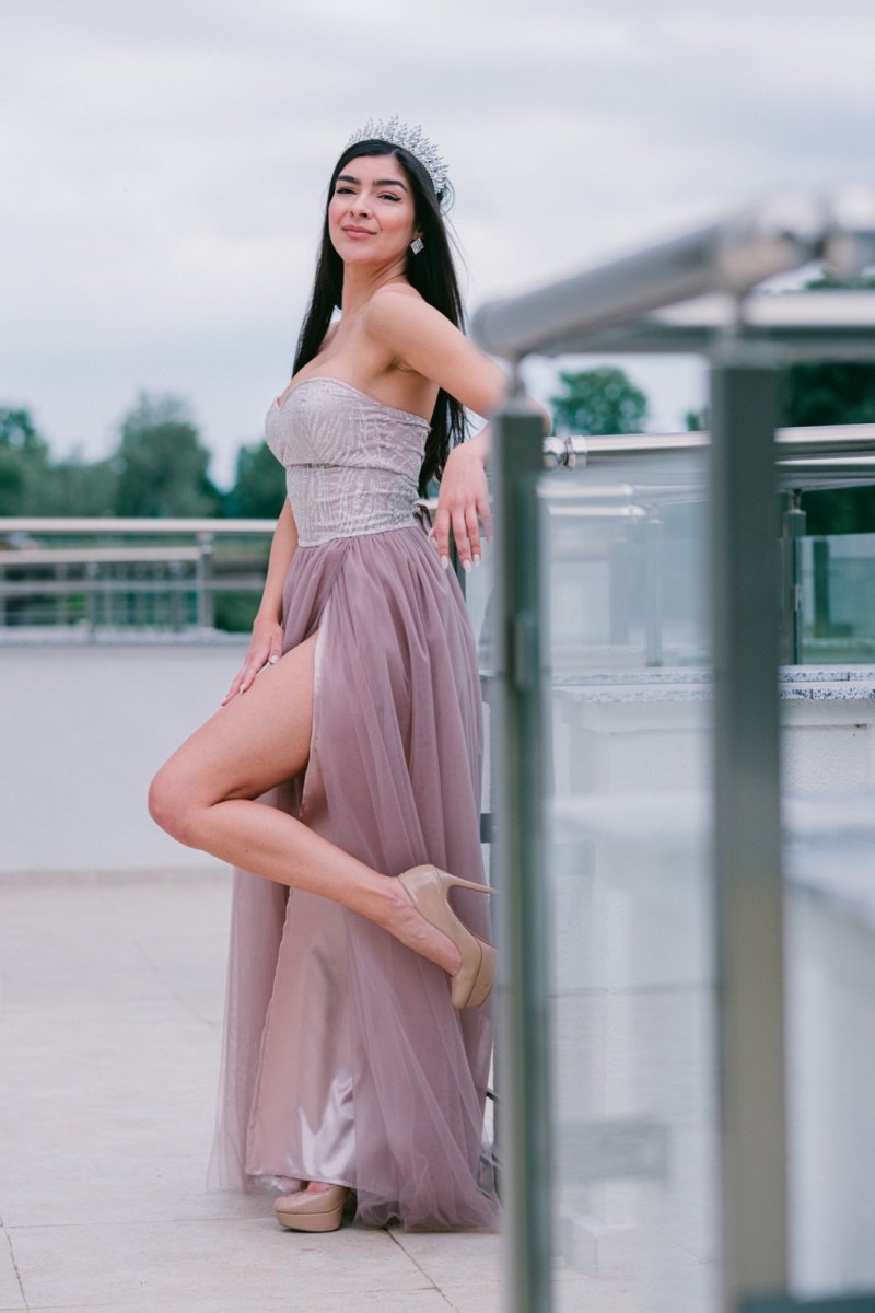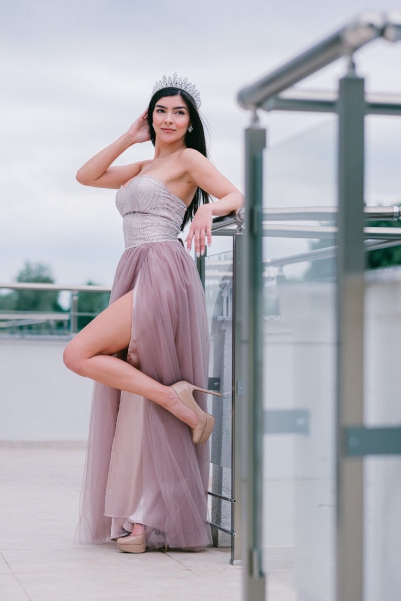 Лекота, женственост и изящество в една рокля! Тази дълга бална рокля съчетава класическа романтика с модерна чувственост. Прилепналото бюстие подчертава извивките, докато ефирната тюлена пола придава лекота и елегантност. Високата цепка добавя доза съблазън и свобода на движение, а неутралният нюанс прави модела универсален и изискан.