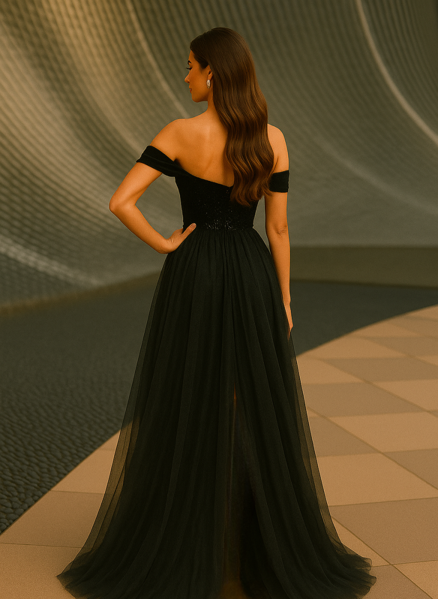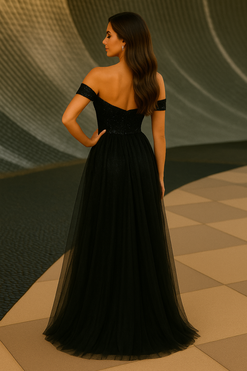 Съчетанието от блестящ корсет с пайети и ефирна многопластова пола от тюл създава магнетичен контраст между дръзкост и ефирност. Голите рамене подчертават женствената елегантност, а дълбоката цепка придава съблазнителна загадъчност.