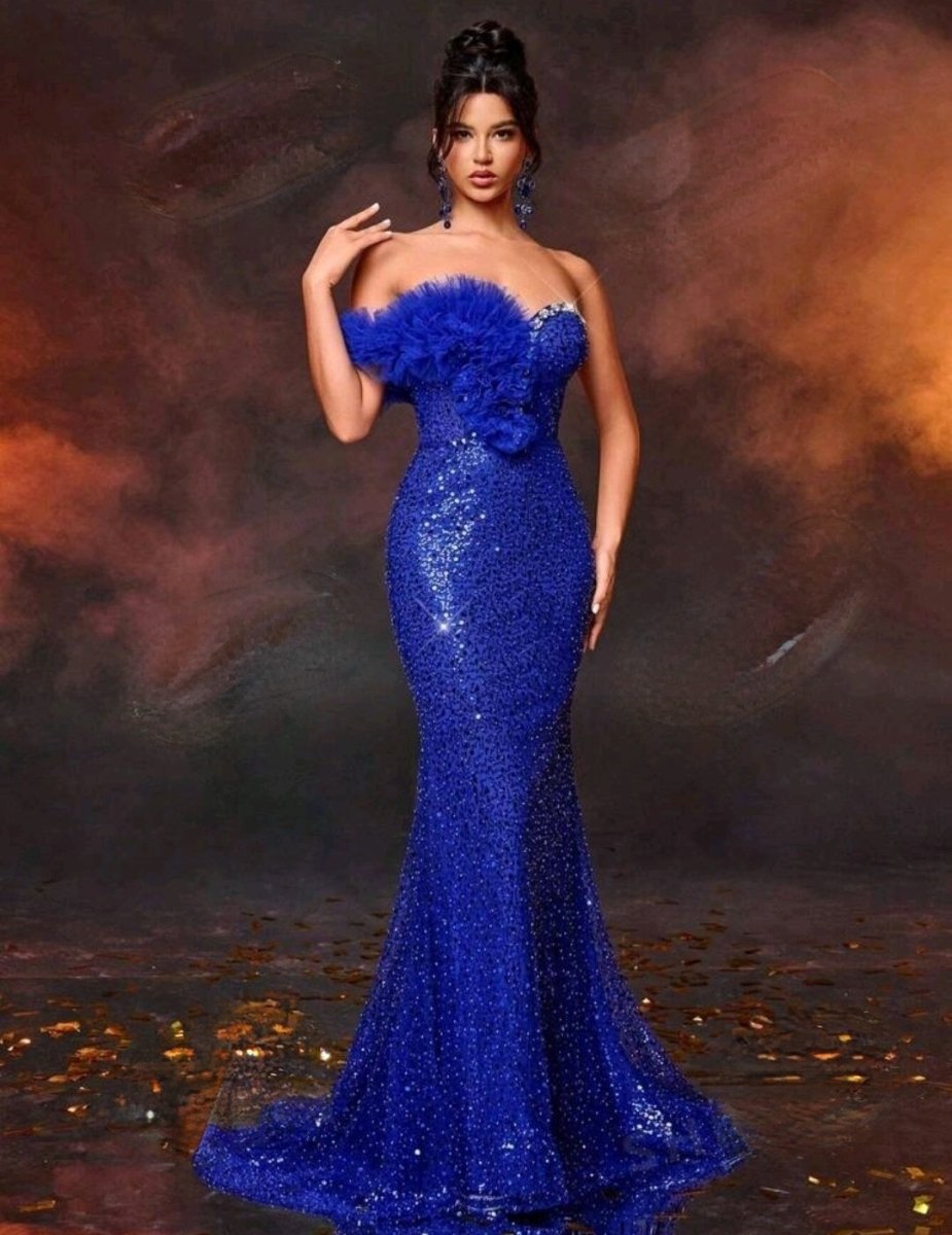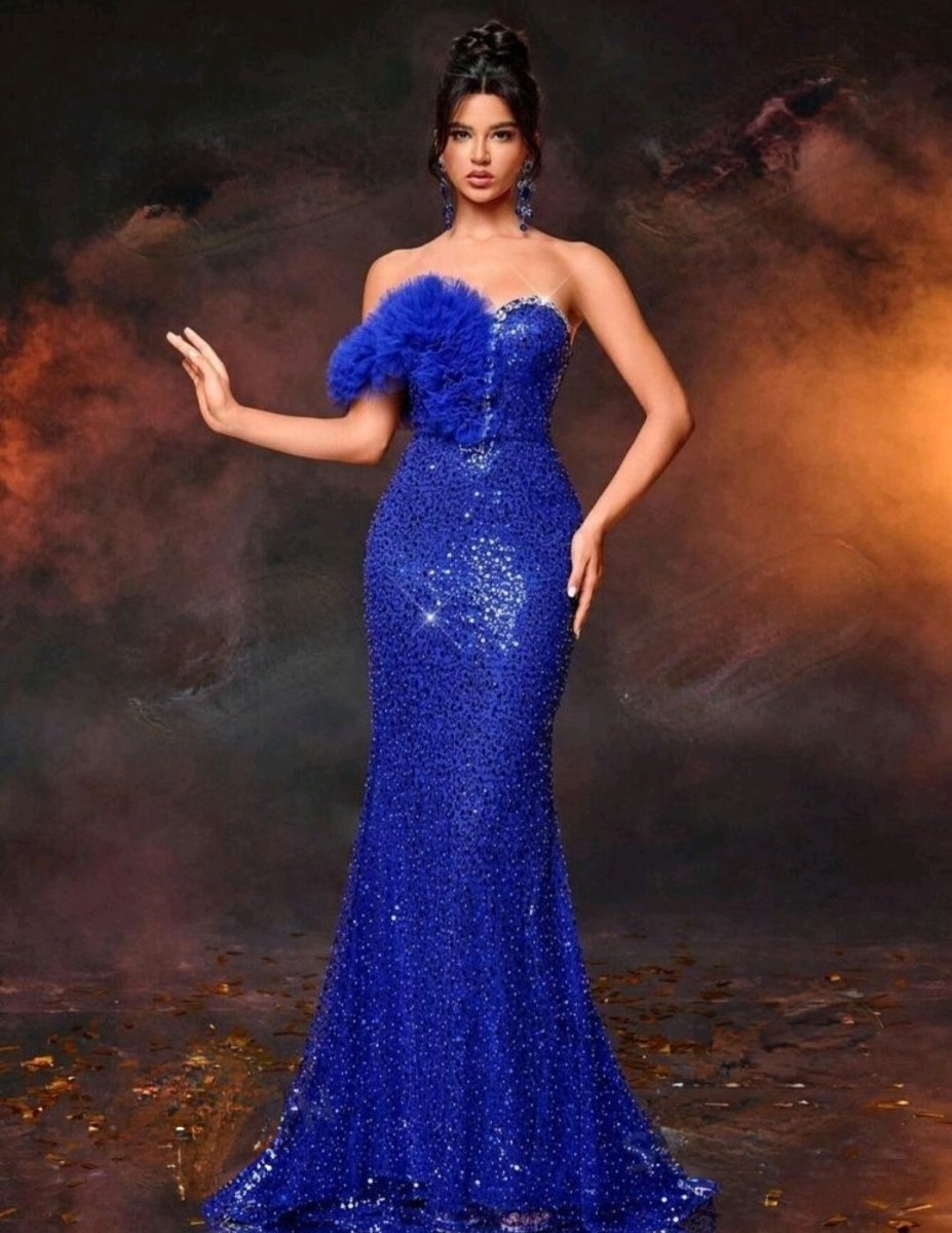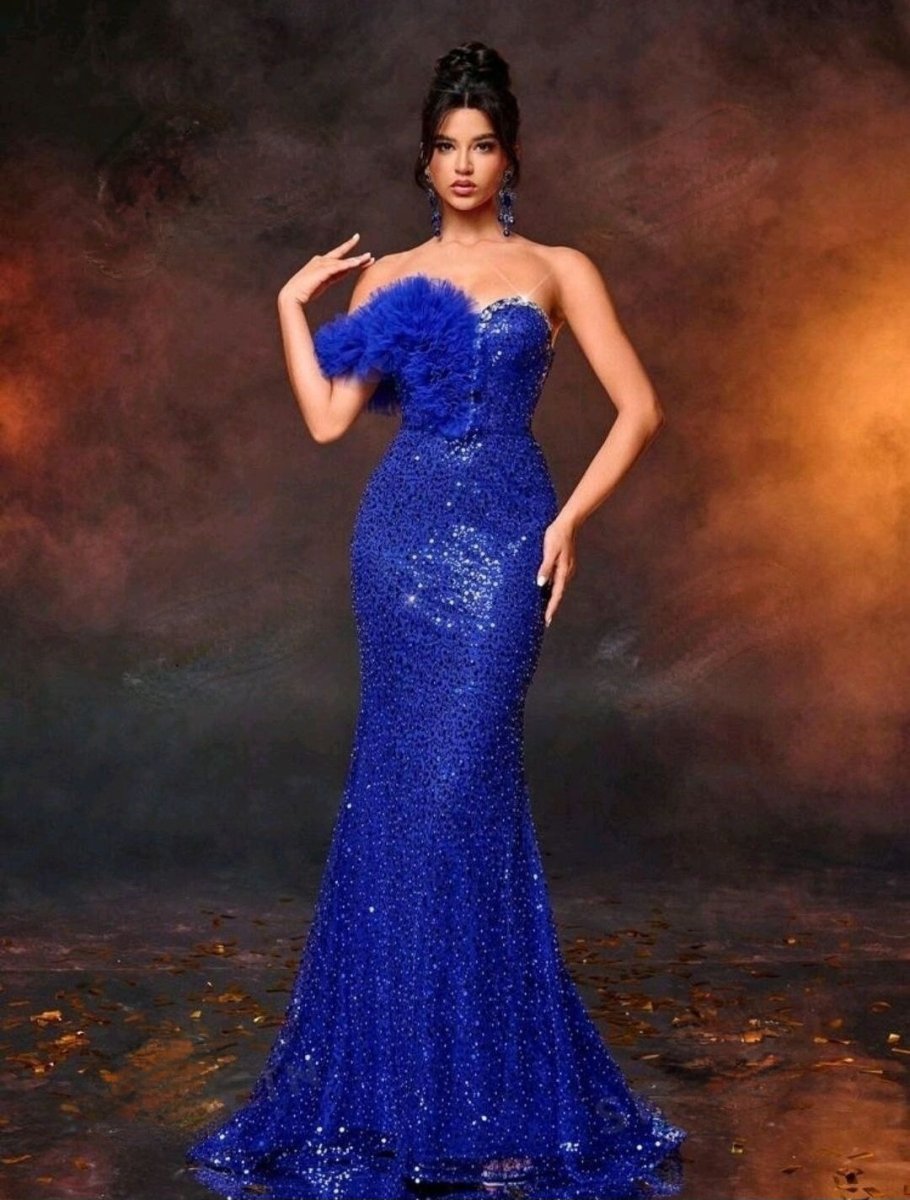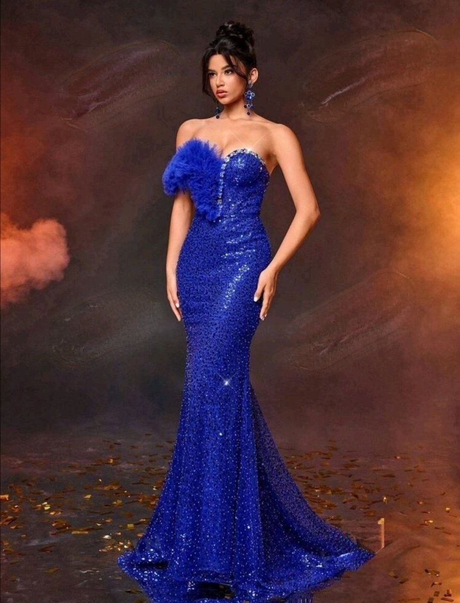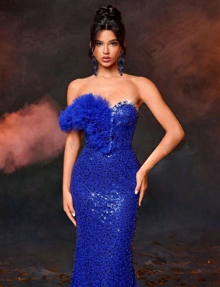 Заблестете като звезда с нашата уникална кралско синя официална рокля, украсена с изящни кристали! Създадена за жени с вкус към лукса, тази рокля привлича всички погледи с впечатляващата комбинация от блестящи пайети и фини тюлени детайли. Горната част е украсена с асиметричен волан и деликатно поставени кристали, които добавят нотка на блясък и изтънченост. Сърцевидното деколте подчертава женствеността, а прилепналият силует акцентира върху извивките. Подходяща за балове, гала вечери или специални събития, тази рокля е истинско произведение на изкуството.