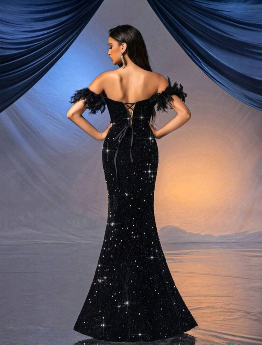 Дълга официална черна рокля с пайети и пера