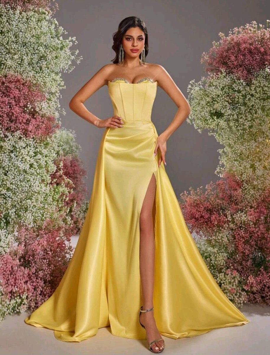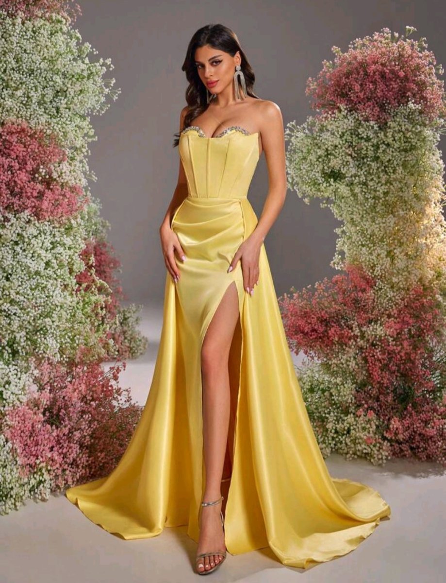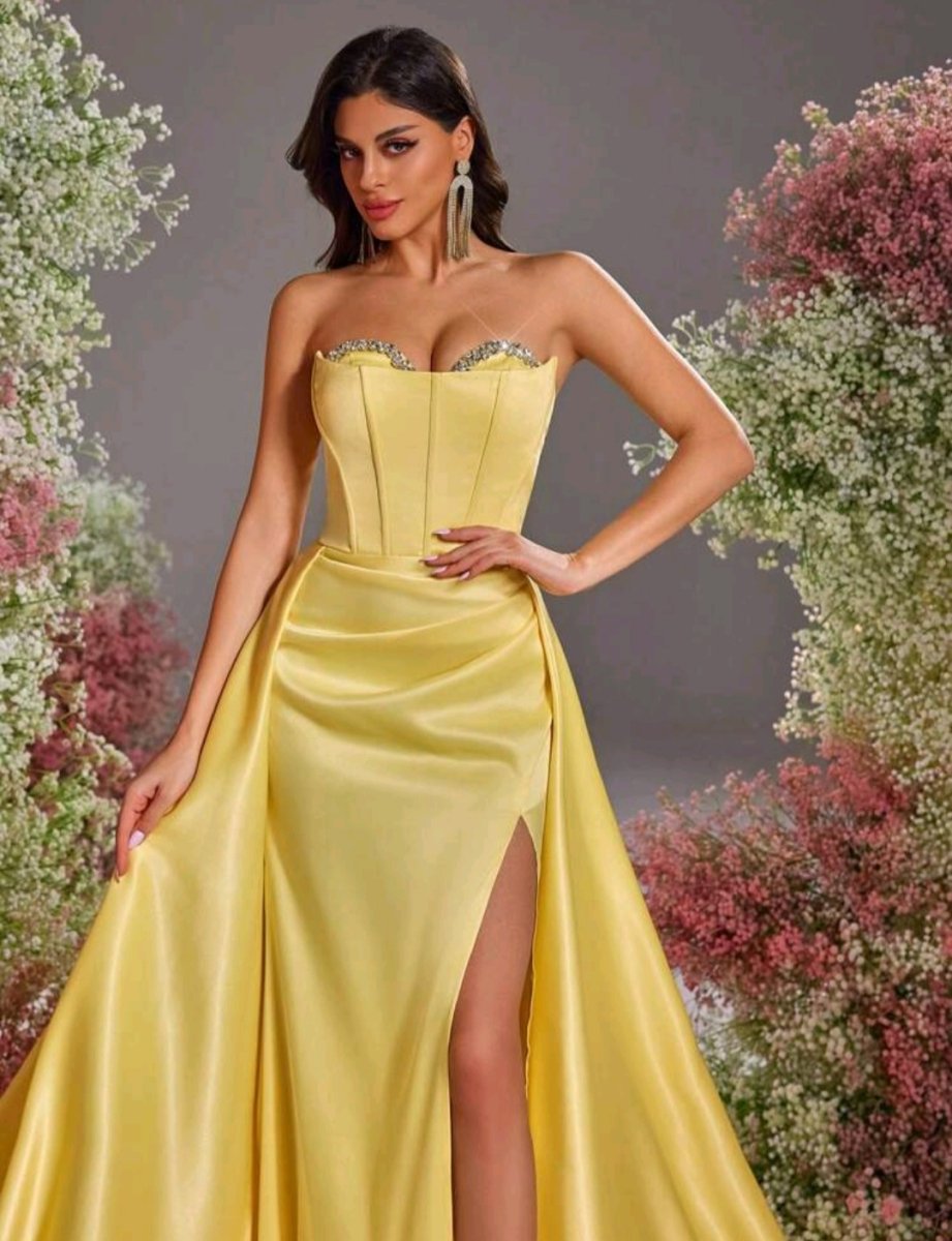 Сияй като слънце в тази разкошна дълга рокля в жълто – цвят на увереността и енергията. С изящен корсет, обсипан с деликатни детайли, и ефирен шлейф, който придава кралско излъчване. Дръзката цепка добавя доза чувственост, докато сатенената материя нежно подчертава силуета. Тази рокля е създадена за жени, които обичат да впечатляват и да бъдат център на вниманието!