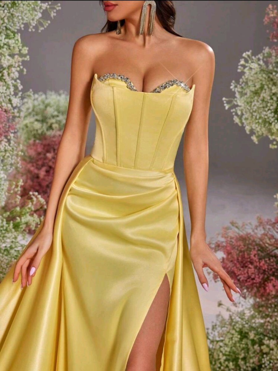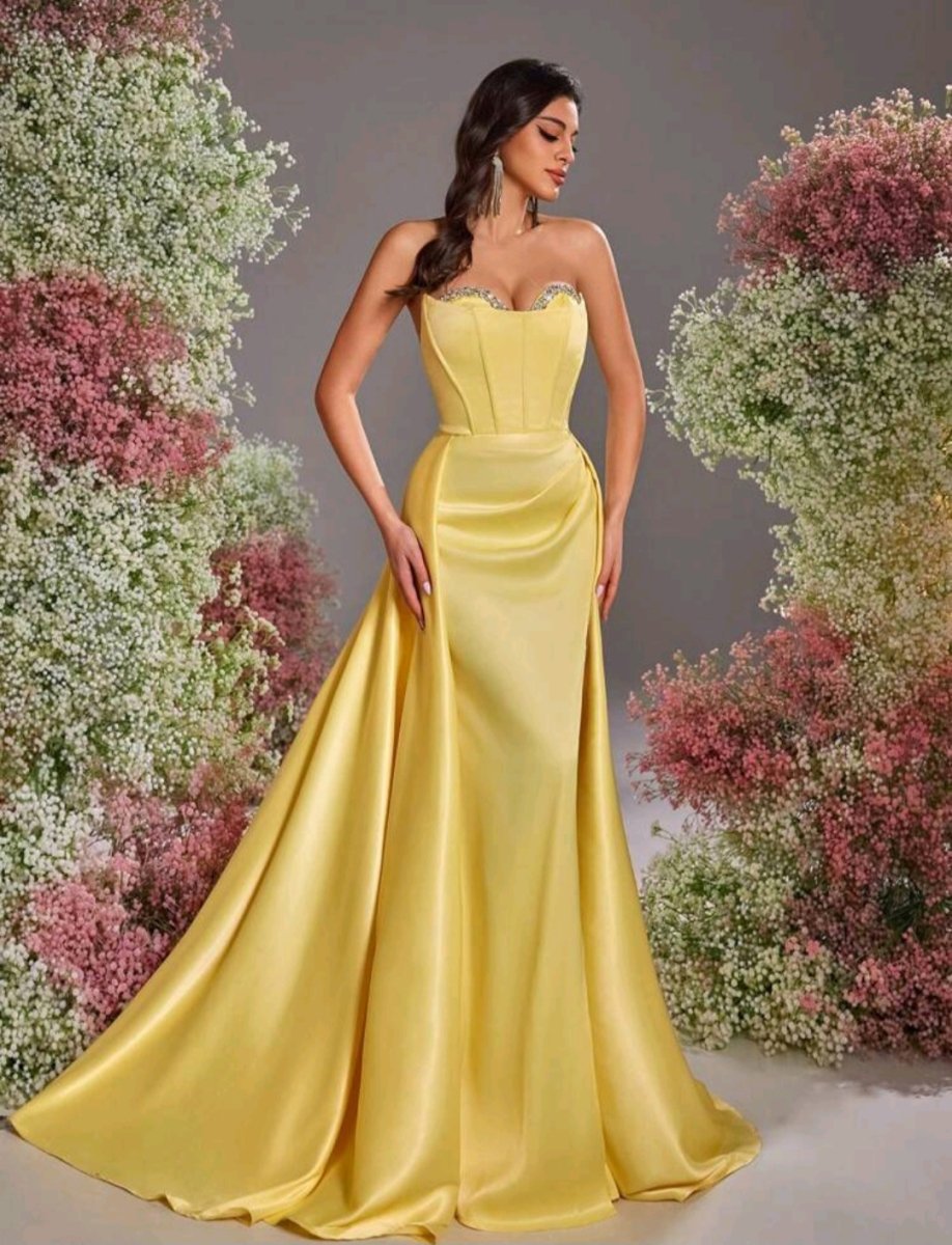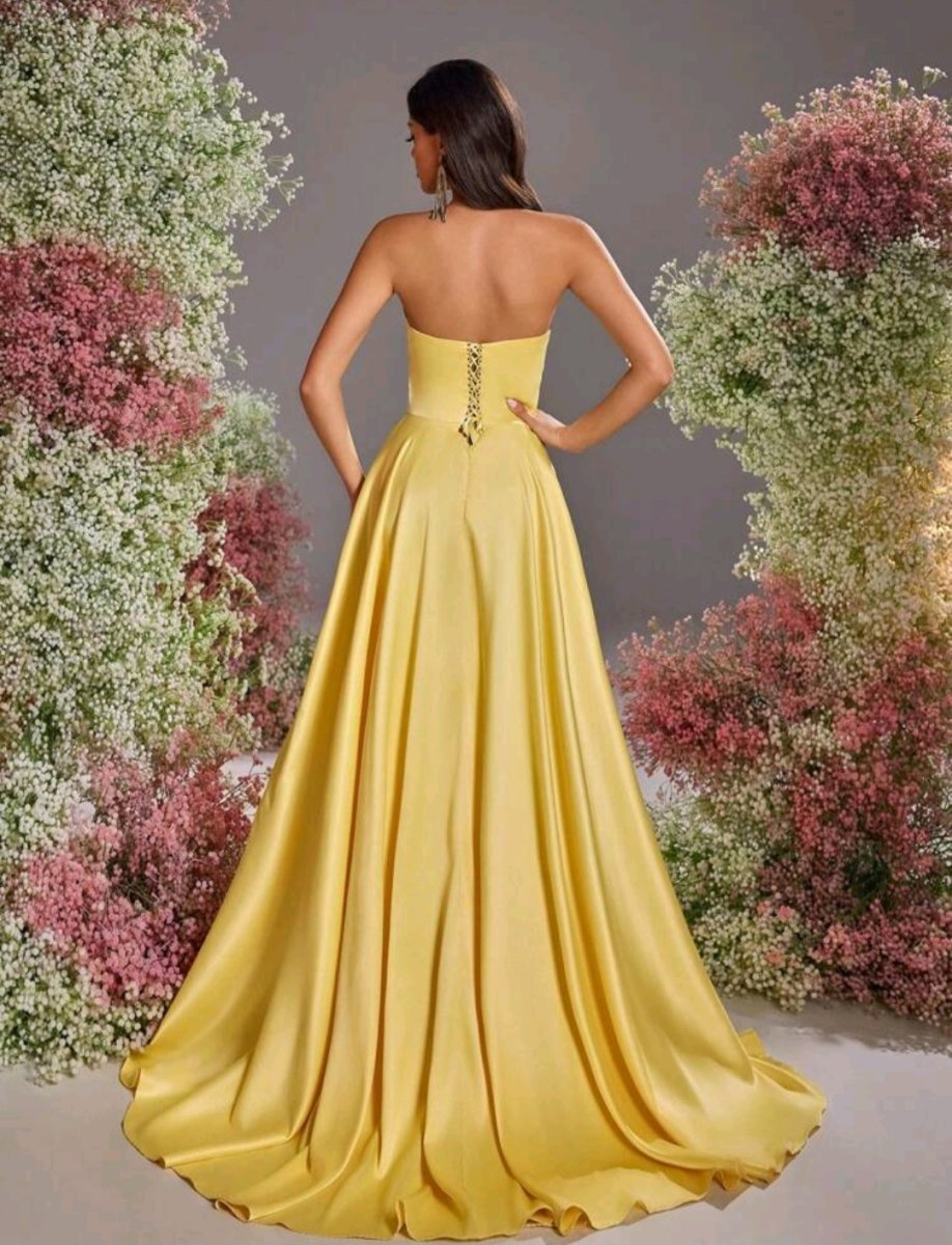 Сияй като слънце в тази разкошна дълга рокля в жълто – цвят на увереността и енергията. С изящен корсет, обсипан с деликатни детайли, и ефирен шлейф, който придава кралско излъчване. Дръзката цепка добавя доза чувственост, докато сатенената материя нежно подчертава силуета. Тази рокля е създадена за жени, които обичат да впечатляват и да бъдат център на вниманието!