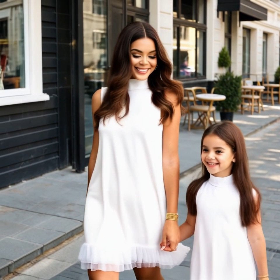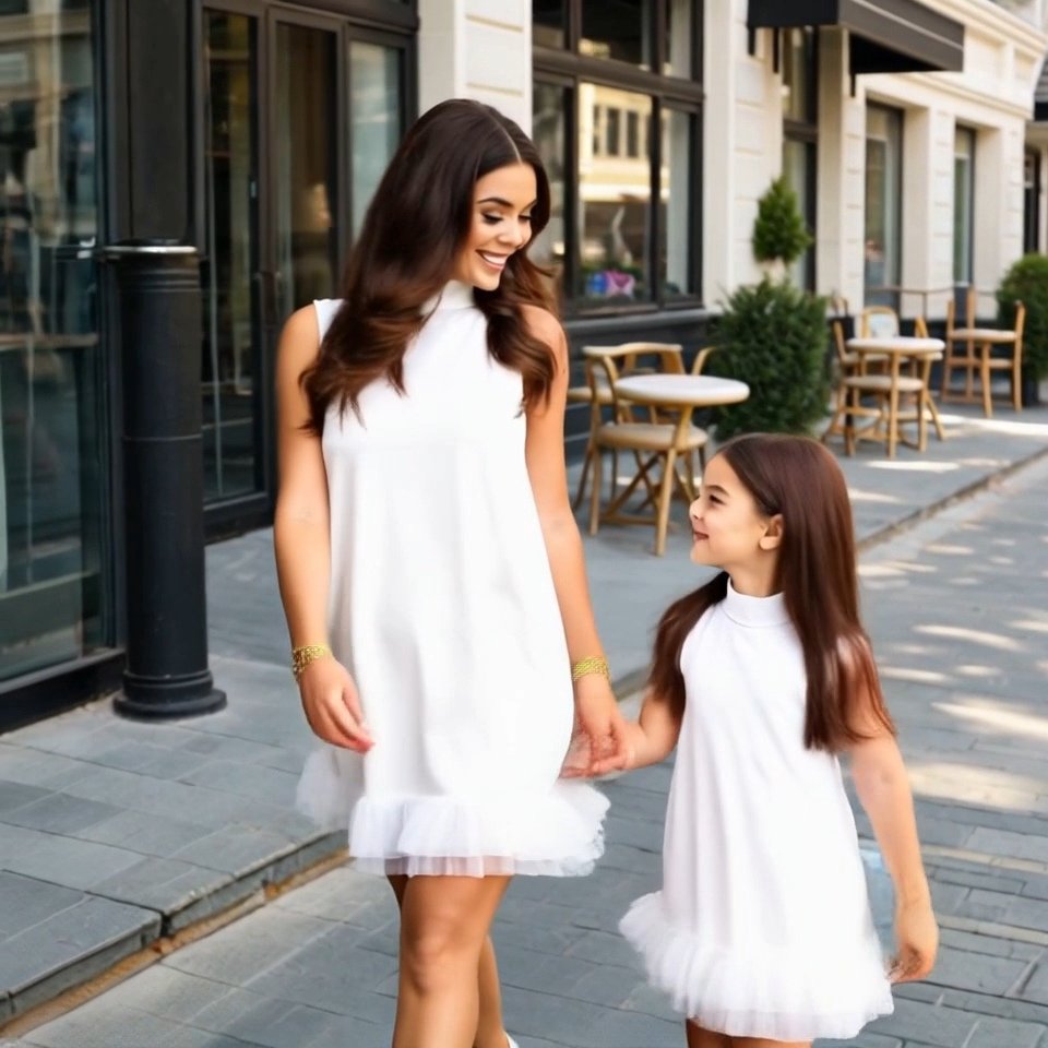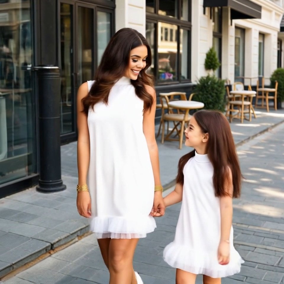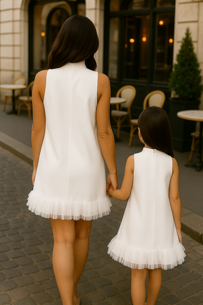 Комплект еднакви бели рокли за майка и дъщеря с воланчета