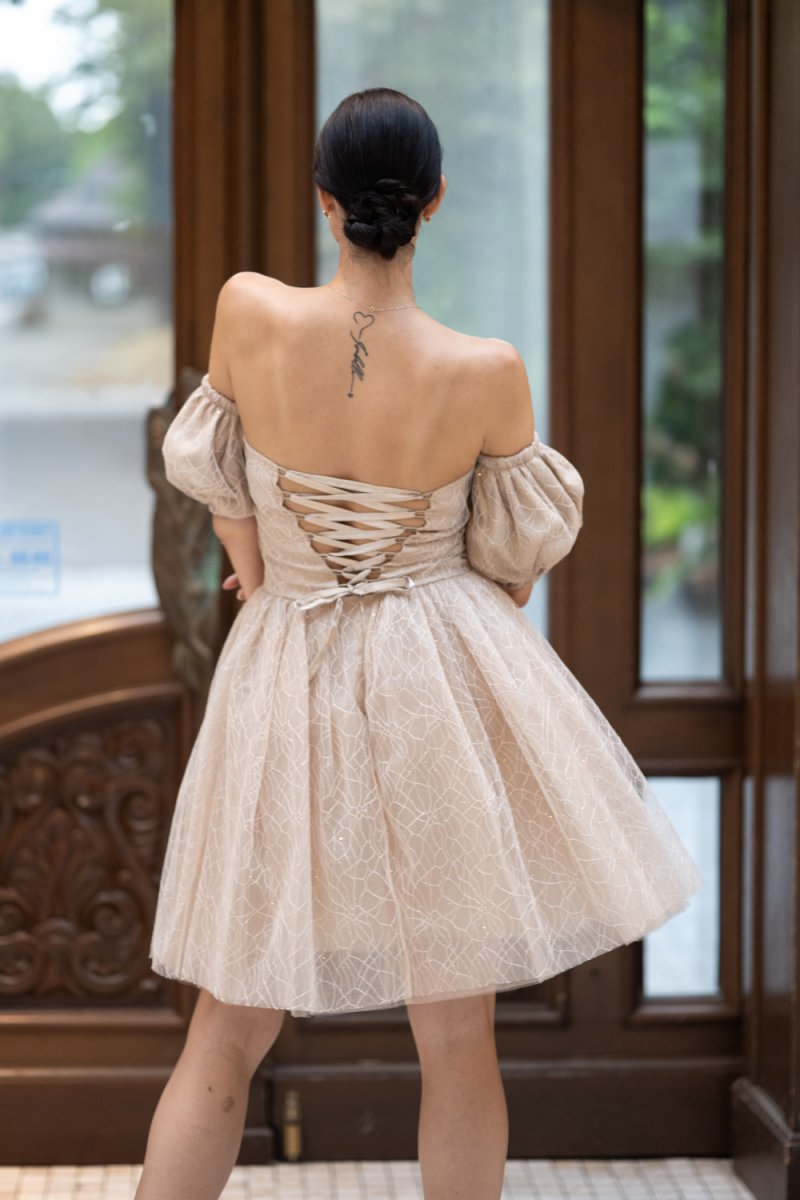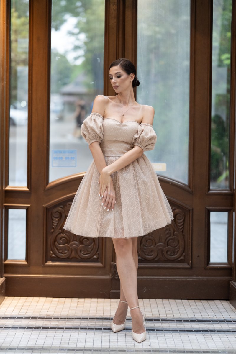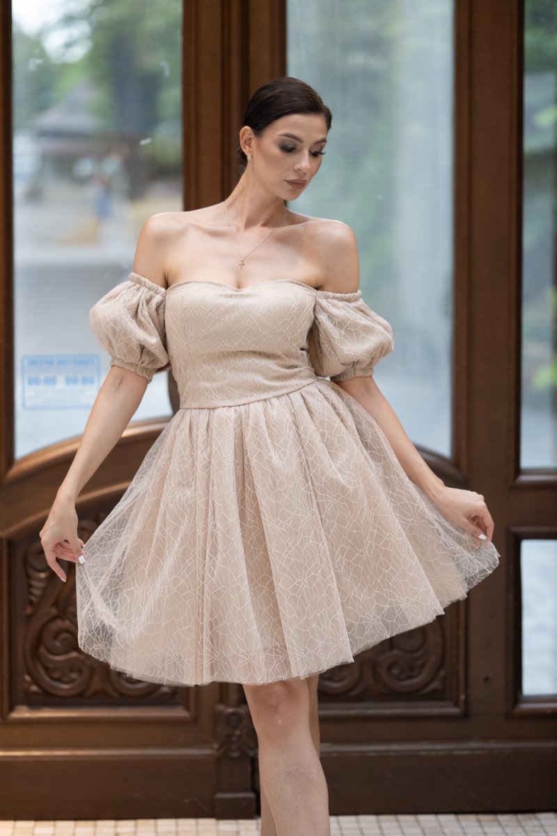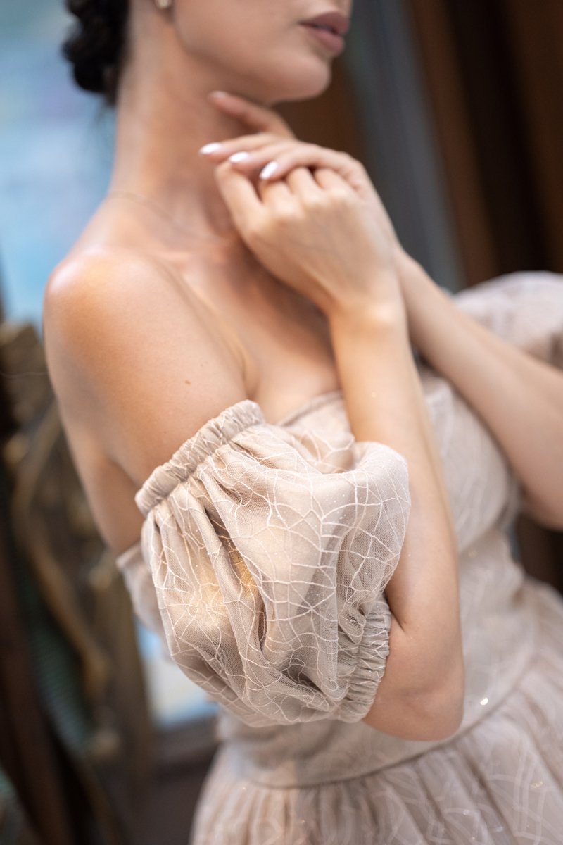 Дамският модел е изработен от фин бежов тюл с деликатен релеф, украсен с обемни ръкави и открити рамене. Корсетният гръб с връзки подчертава талията и създава безупречен силует.