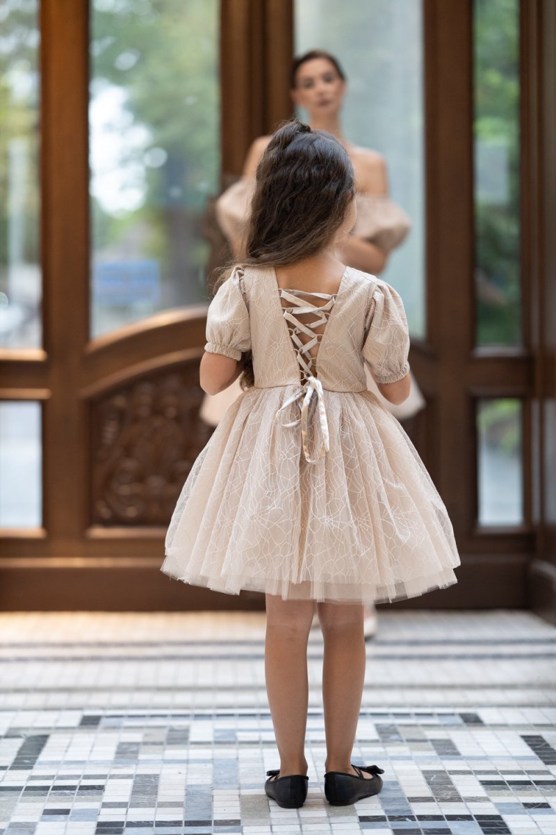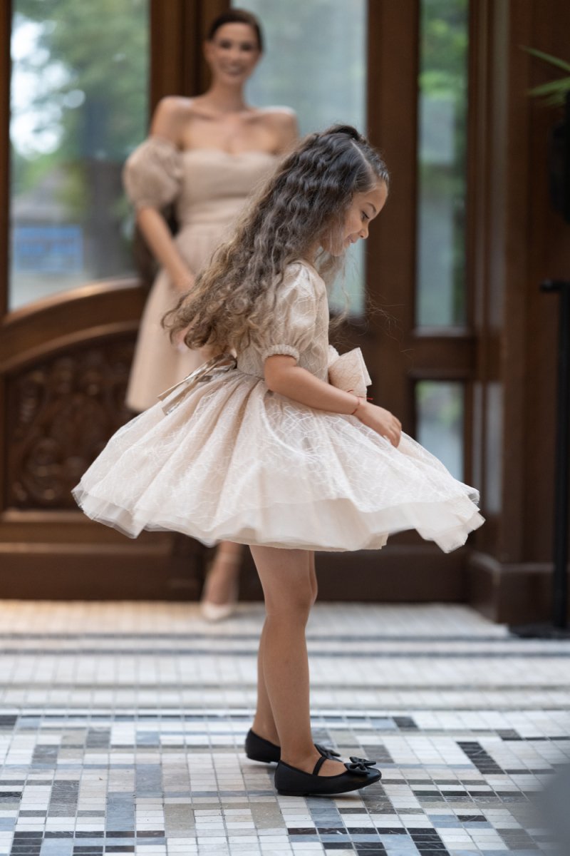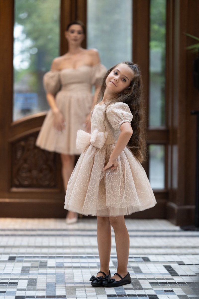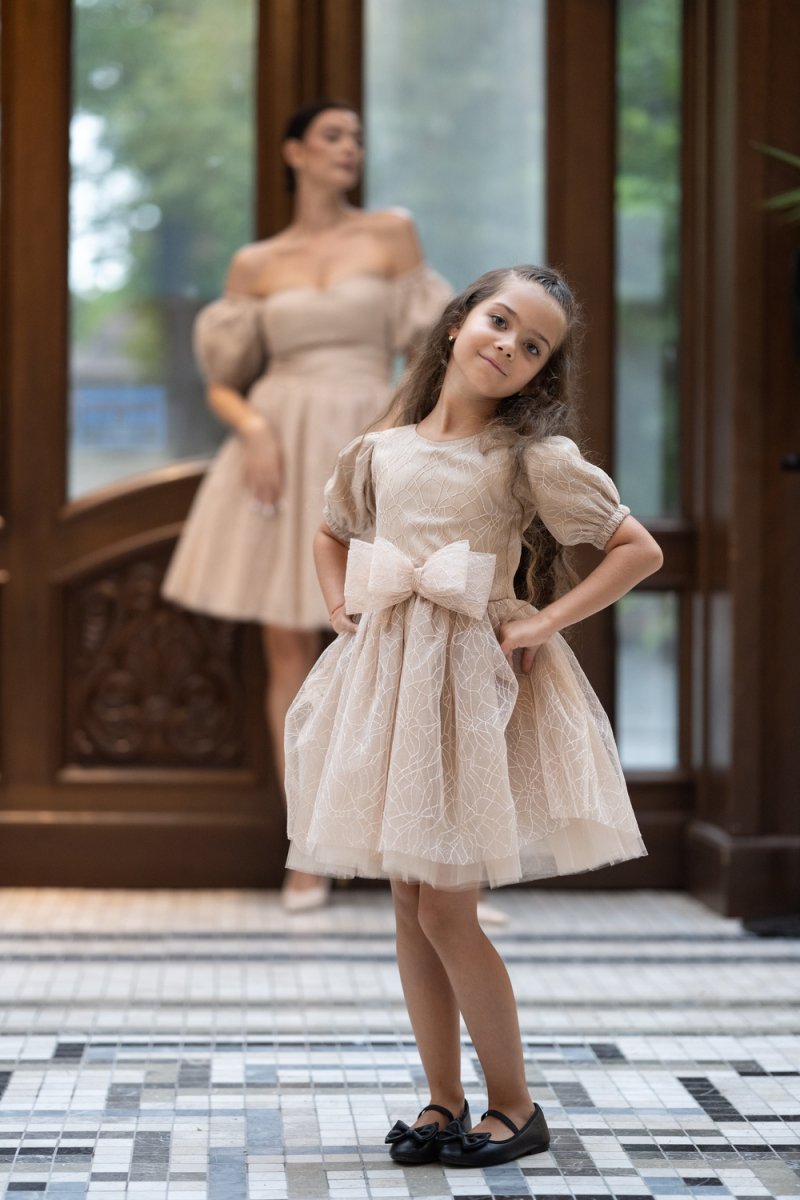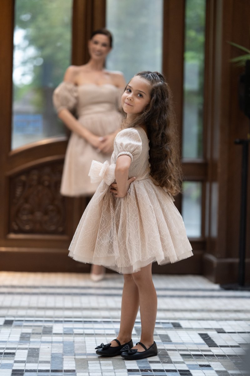 Детската рокля е изработена от фин бежов тюл с релеф, допълнена с удобна подплата за мекота и комфорт. Акцентът е върху голямата панделка на талията – детайл, който превръща всяко момиченце в малка принцеса.