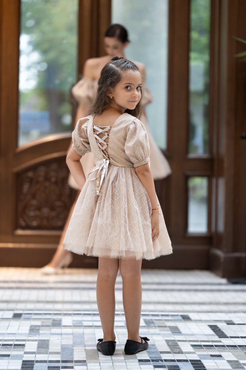 Детска рокля с блестящ бежов тюл