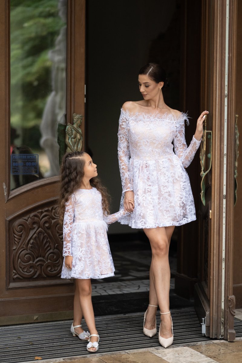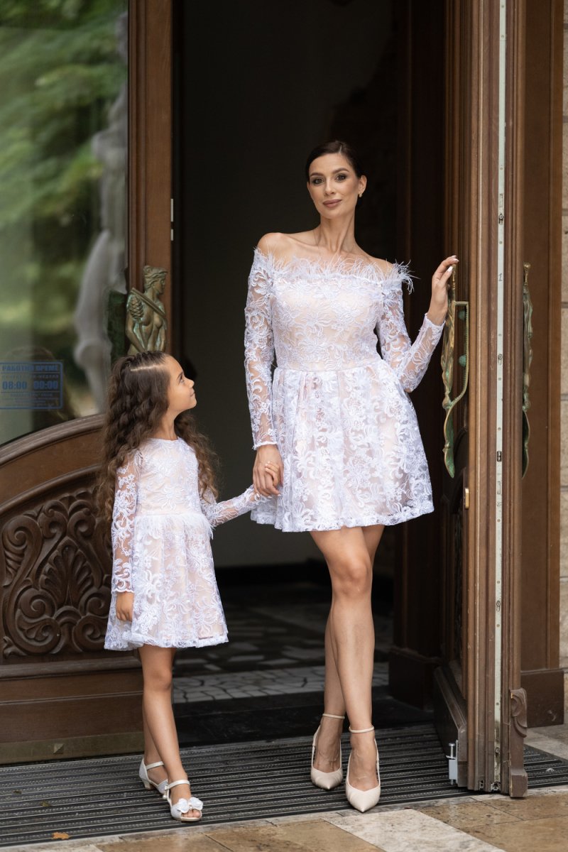 Комплектът „Майка и дъщеря“ е изработен от луксозна бяла дантела върху деликатна прасковена подплата. Дамската рокля впечатлява с деколте, украсено с нежни бели перца, и корсетен гръб със сатенени връзки. Детската рокля е със същата изящна дантела, а акцентът са белите перца, поставени в талията – истинска малка принцеса в стилно мини копие.