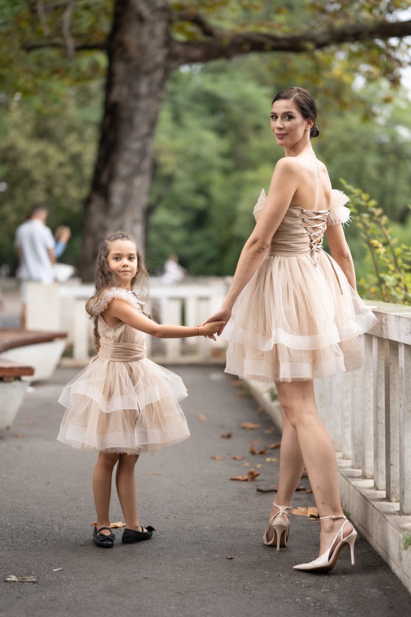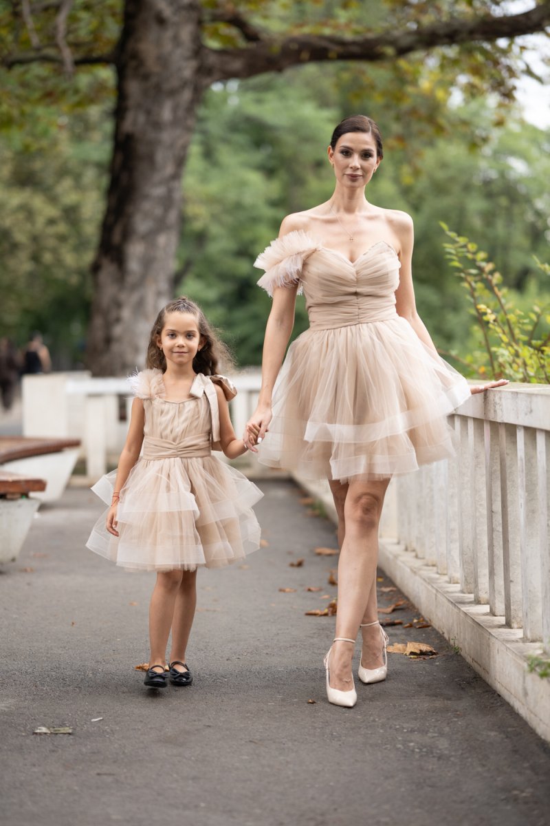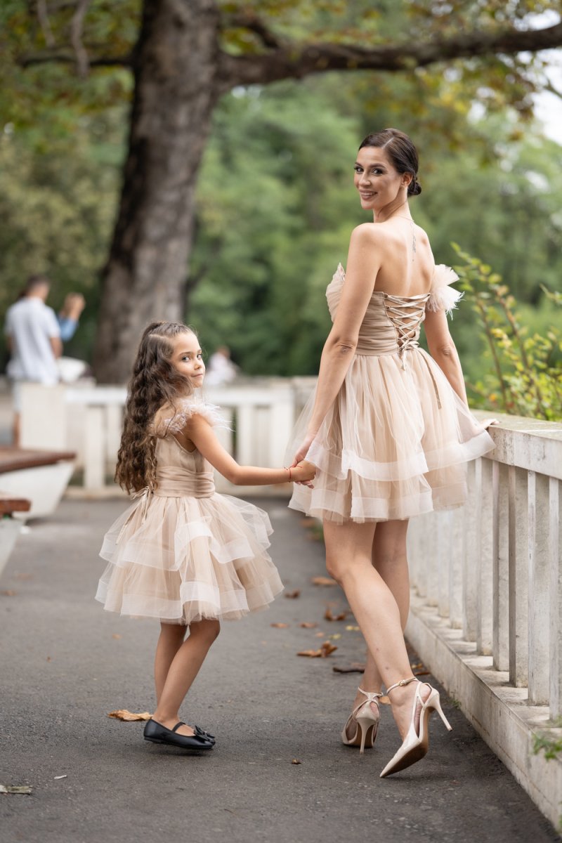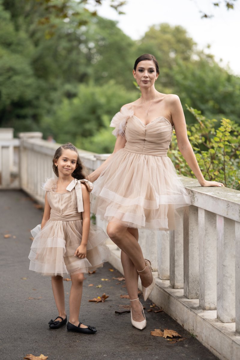 Комплектът „Майка и дъщеря“ е изработен от фина тюлена материя в бежов нюанс, която създава ефирност и обем. Дамската рокля впечатлява с корсетен гръб с връзки, асиметричен силует и акцент от нежни перца на рамото. Детската рокля следва същата визия – тюлена многопластова пола, акценти с перца и сатенена панделка на рамото за завършен празничен чар.