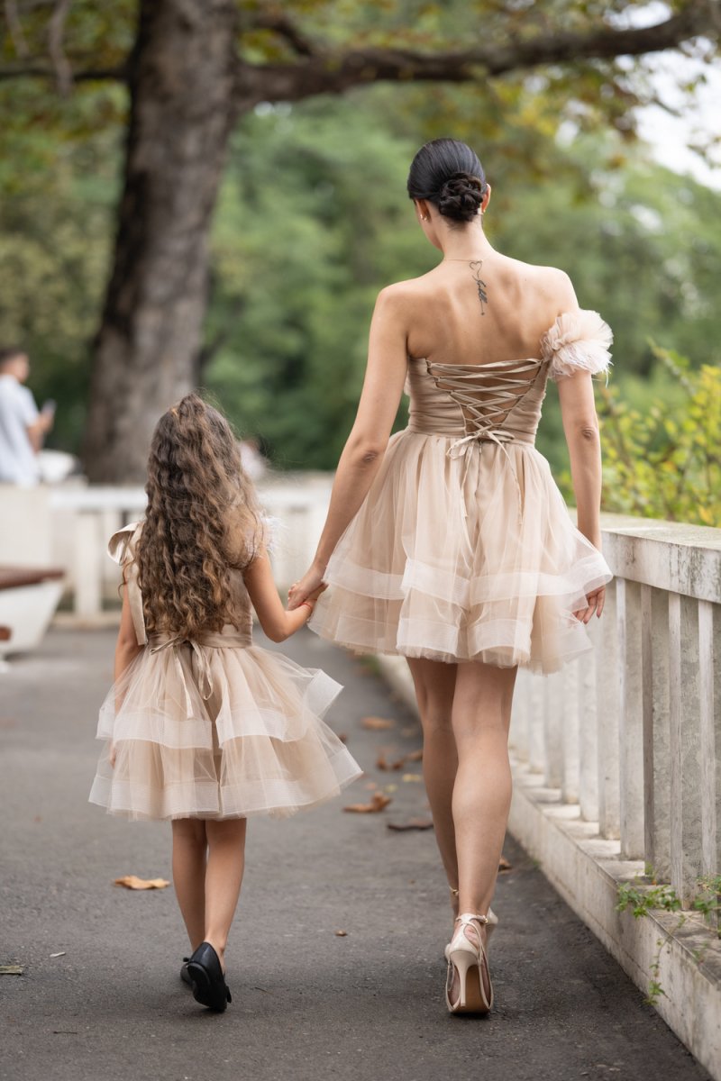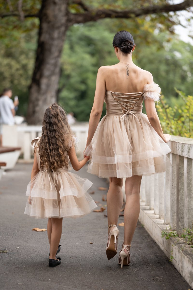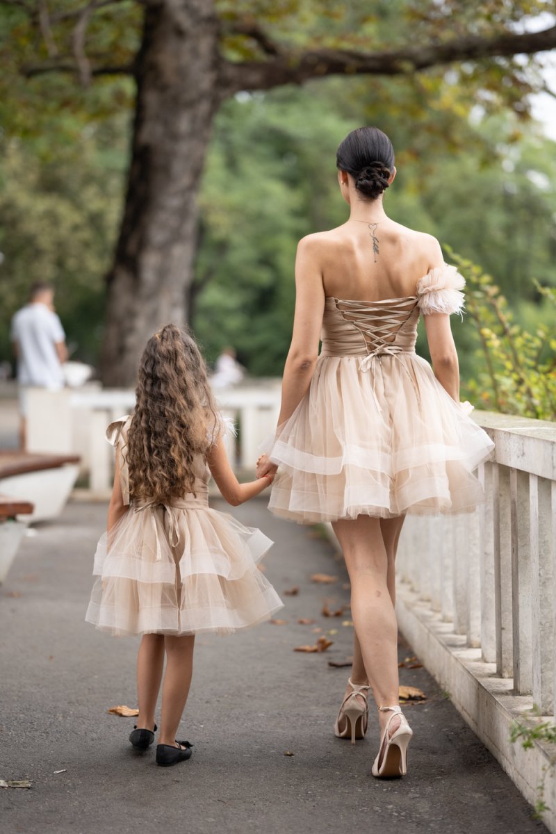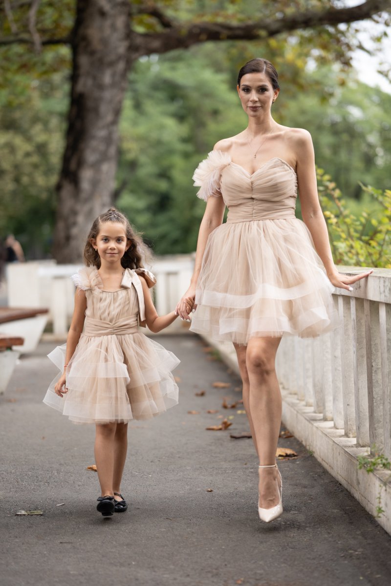 Комплектът „Майка и дъщеря“ е изработен от фина тюлена материя в бежов нюанс, която създава ефирност и обем. Дамската рокля впечатлява с корсетен гръб с връзки, асиметричен силует и акцент от нежни перца на рамото. Детската рокля следва същата визия – тюлена многопластова пола, акценти с перца и сатенена панделка на рамото за завършен празничен чар.