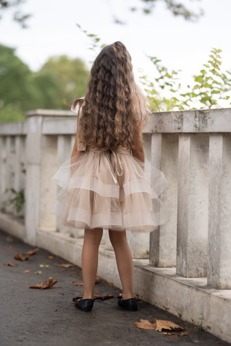 Детската рокля е изработена от ефирен бежов тюл с многопластова пола и подплата за комфорт. Акцентът е поставен върху кокетната сатенена панделка и нежните перца на рамото, които превръщат модела в истинска празнична рокля.