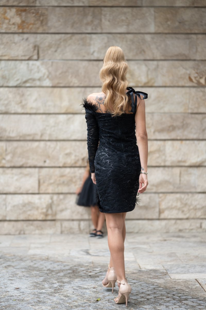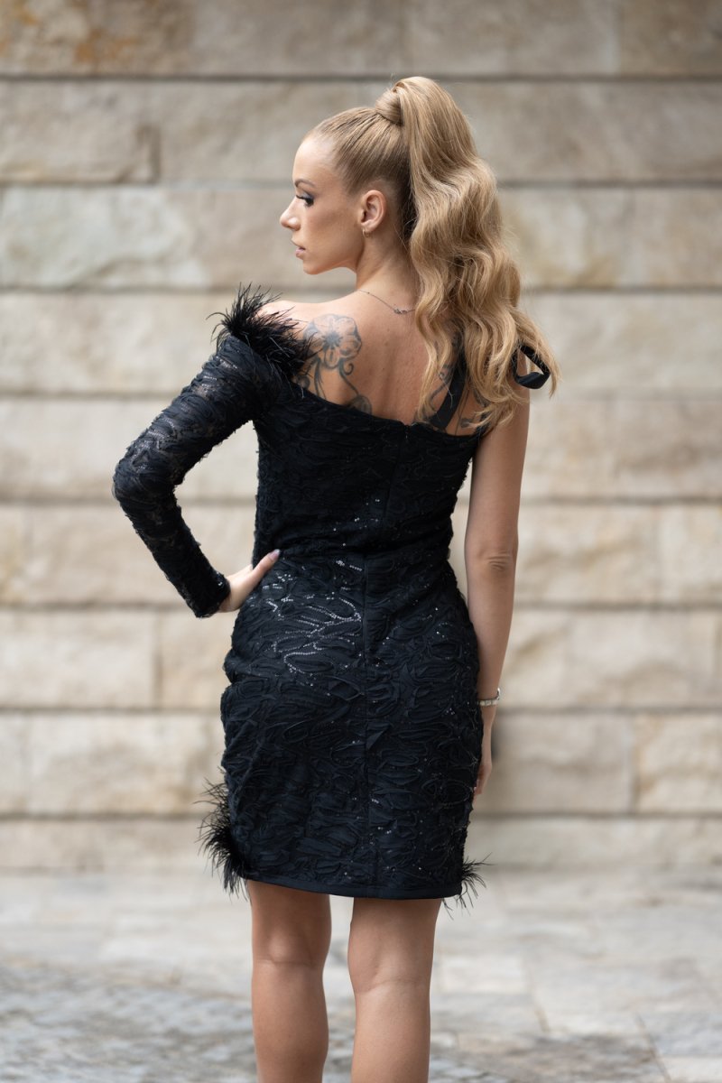 Дамската рокля е в черно, с асиметричен дизайн – едно рамо и дълъг ръкав от дантела, обсипан с пайети. Ефектните пера на рамото и по подгъва добавят луксозен акцент, а вталеният силует подчертава фигурата.