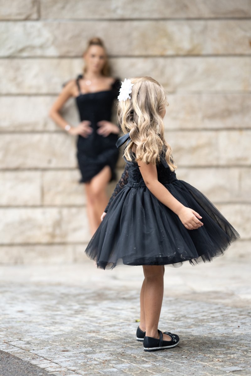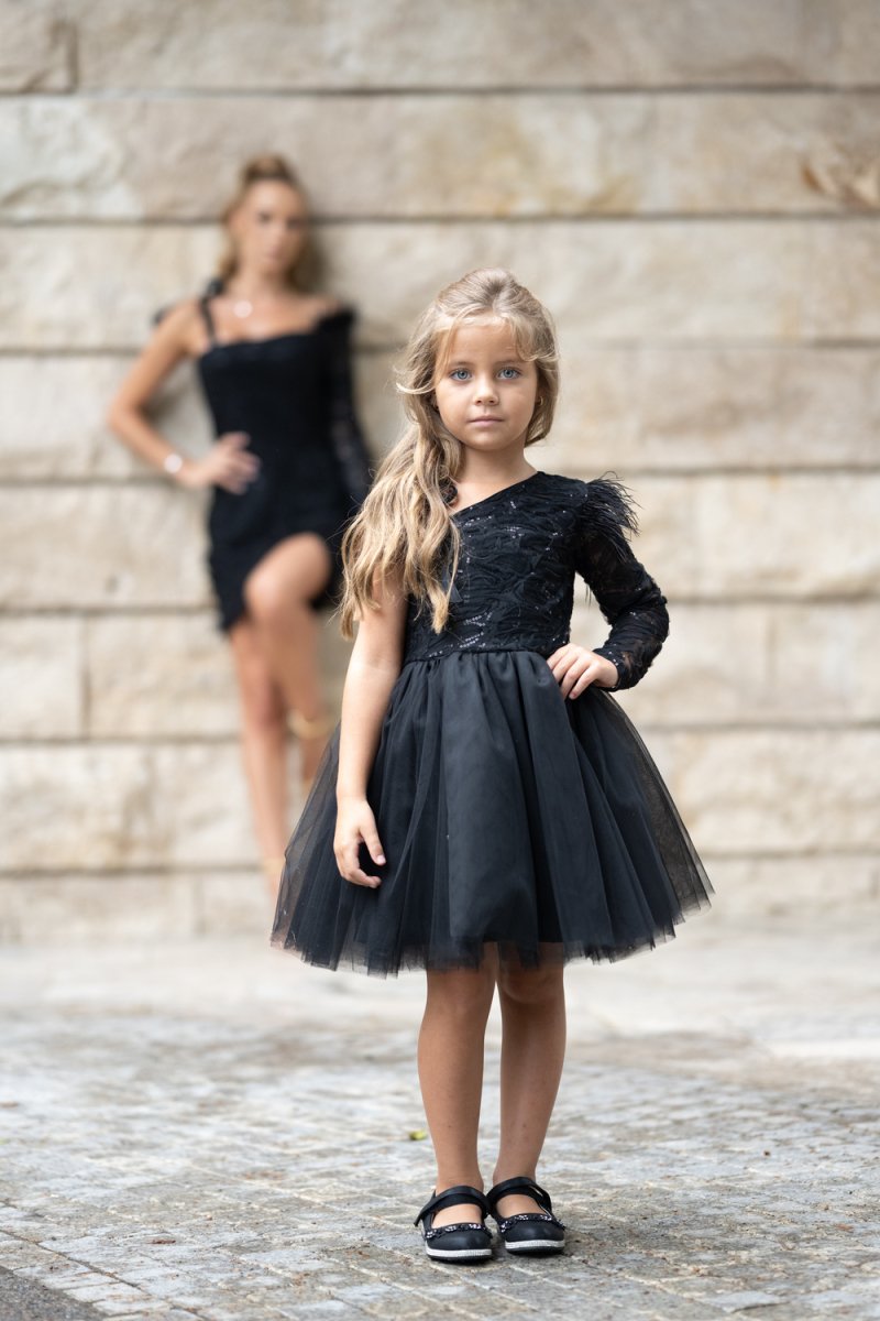 Детска рокля от черна дантела с пера