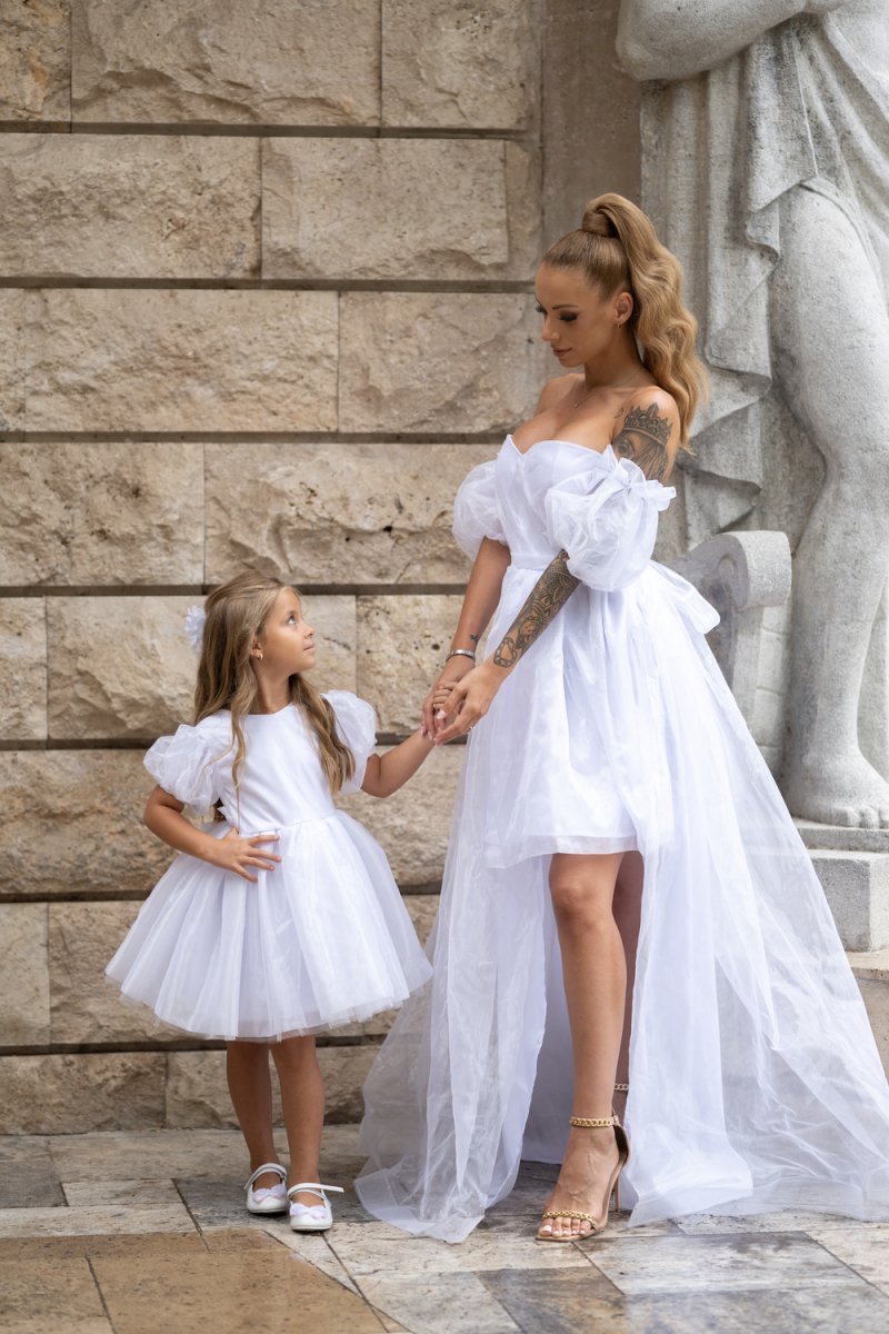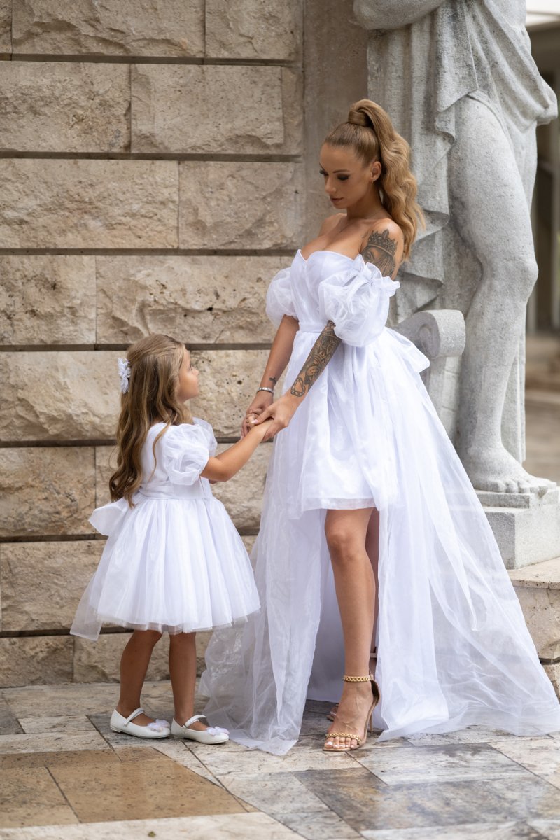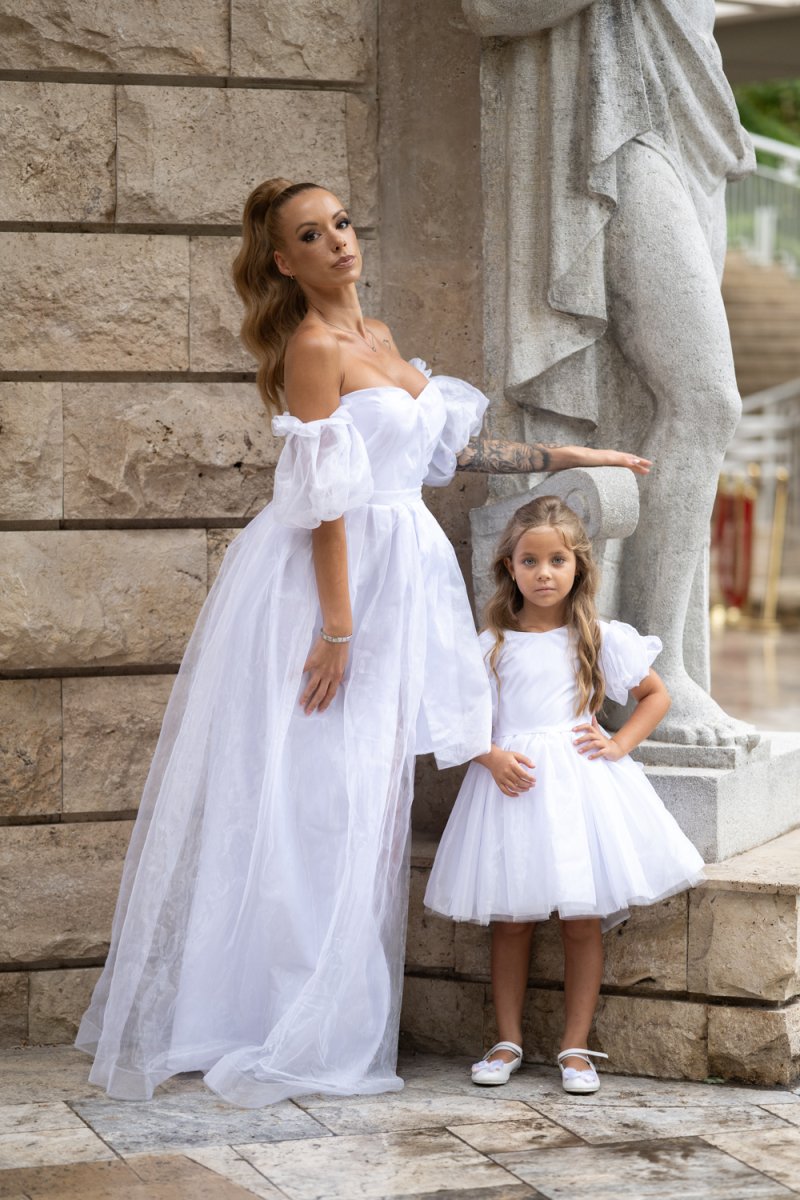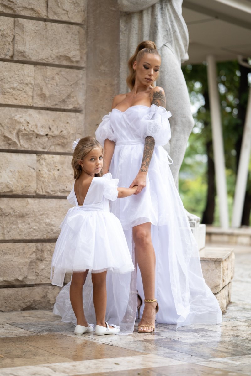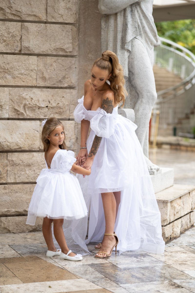 Елегантен и ефирен комплект от бяла органза, който съчетава изящество и нежност в перфектна хармония. Дамската рокля впечатлява с корсетено бюстие и ефектни буфан ръкави, завършващи с дълъг асиметричен шлейф. Детската рокля следва стилистиката – бухнала пола от тюл и панделка отзад за завършеност.