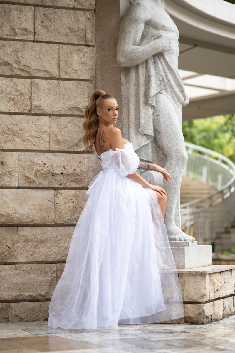 Създадена да впечатлява, тази рокля от органза е истински символ на елегантност. Корсетен силует,  буфан ръкави и дълъг шлейф, който придава изящество.