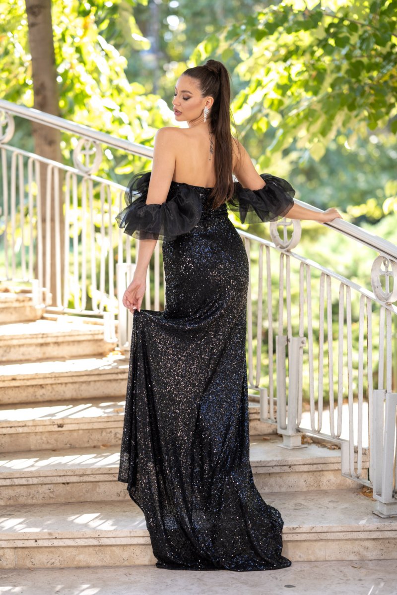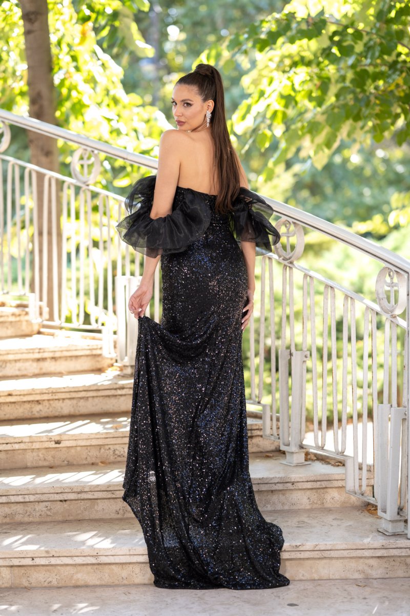 Когато искаш да изглеждаш като кралица – тази рокля е твоето оръжие. Черната пайетена визия прегръща тялото с блестяща изисканост, а ефектните ръкави от органза добавят величие, което не може да остане незабелязано и подчертават силата и елегантността на присъствието ти. Силуетът е изваян, изискан и смел – създаден, за да покорява. Всяка твоя стъпка е блясък, всяко движение – послание. Това е рокля за върхове, сцени и мигове, в които трябва да бъдеш единствена.
