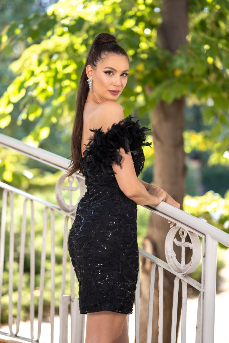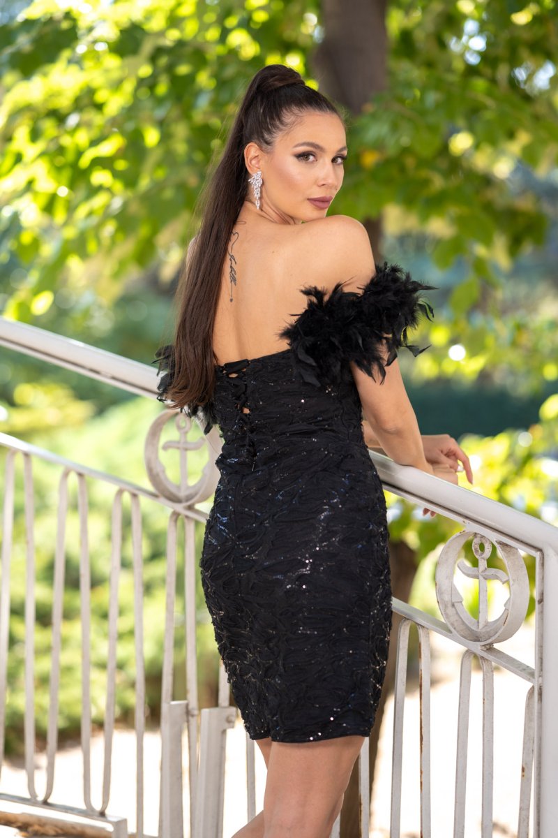 За жени, които влизат и оставят следа. Тази къса черна рокля на JNSecret съчетава мистерия и женственост в съвършен баланс. Релефният бляскав плат обгръща тялото с изискан силует, перата по раменете добавят артистичен акцент, а корсетният гръб подчертава всяка извивка. Това е рокля за кралици на вечерта – дръзки, стилни и запомнящи се.