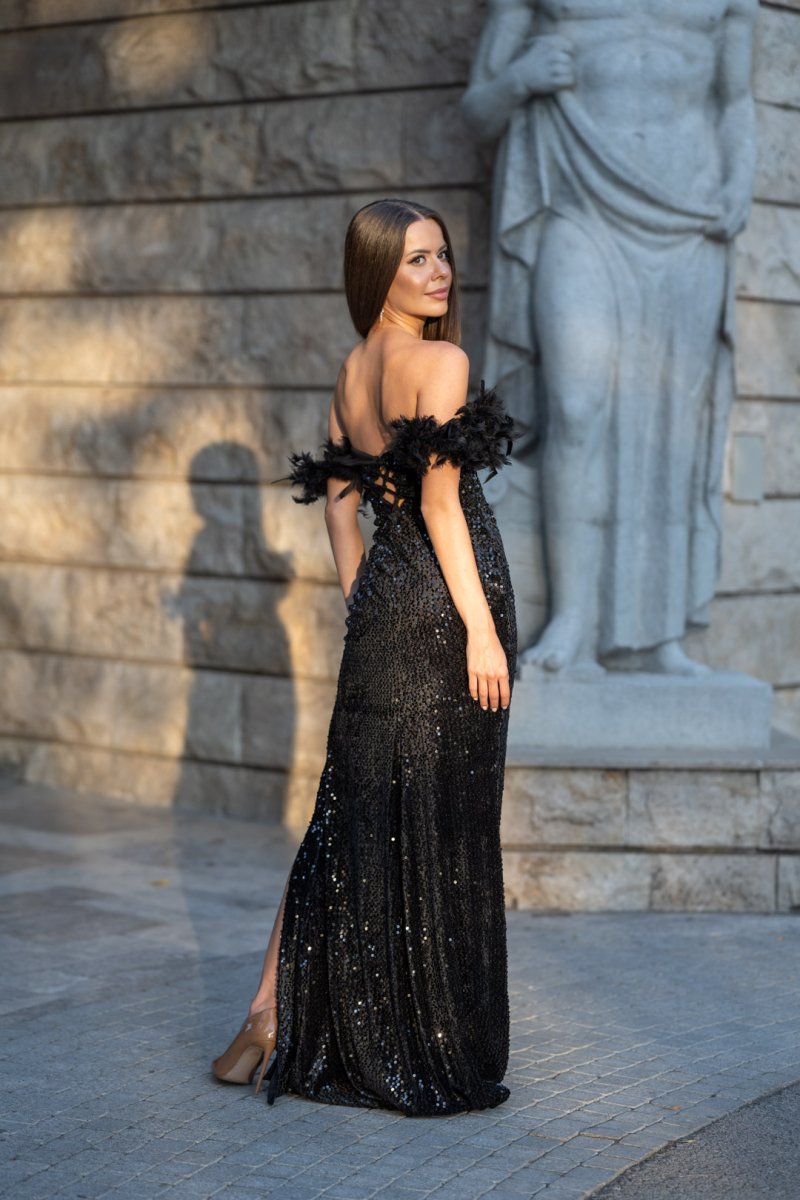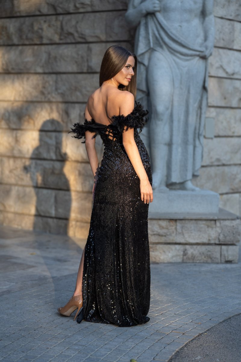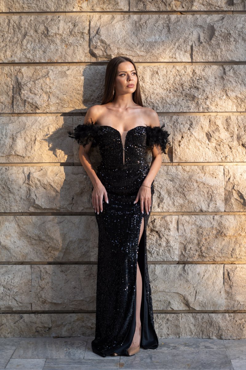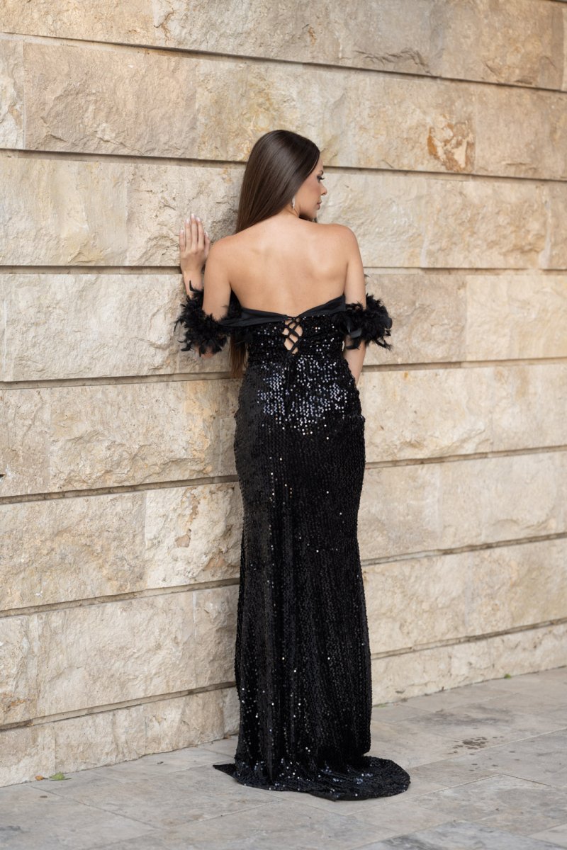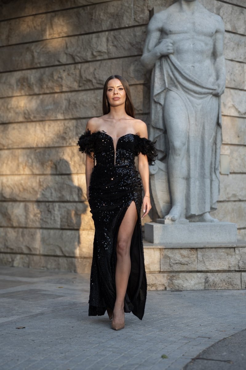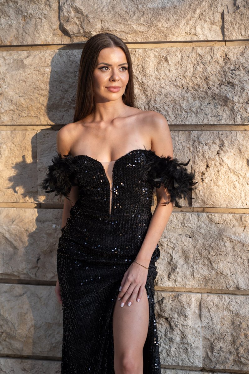 Кралска визия, която покорява още с първата стъпка. Тази черна дълга рокля е изработена от луксозен плат кадифе с блестящи пайети, които озаряват всяко движение. Дълбокото деколте подчертава женствеността, а ръкавите с пера добавят изискан акцент. Корсетът на гърба оформя силуета, докато високата цепка придава доза смелост и елегантен сексапил.