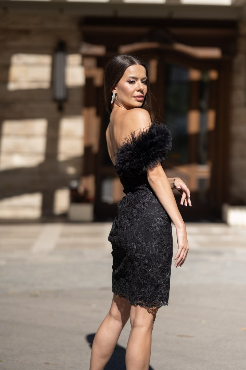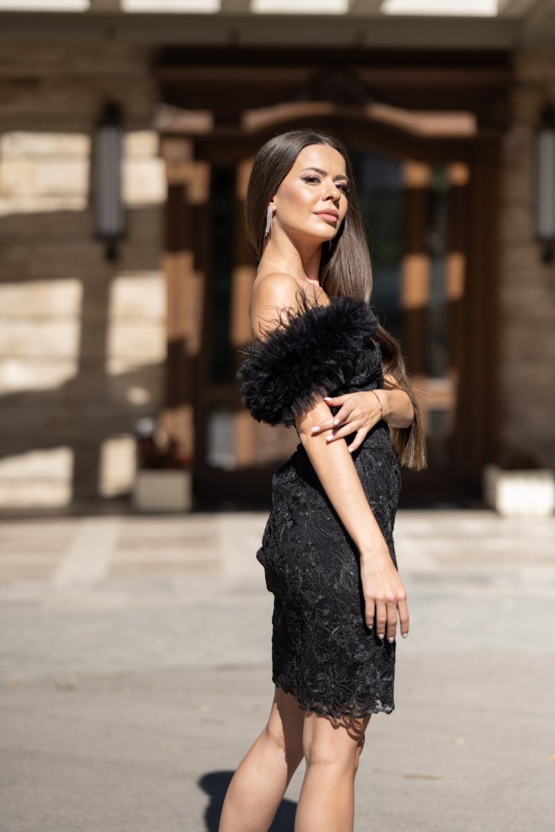Черна дантелена рокля с акцент от тюл и пера