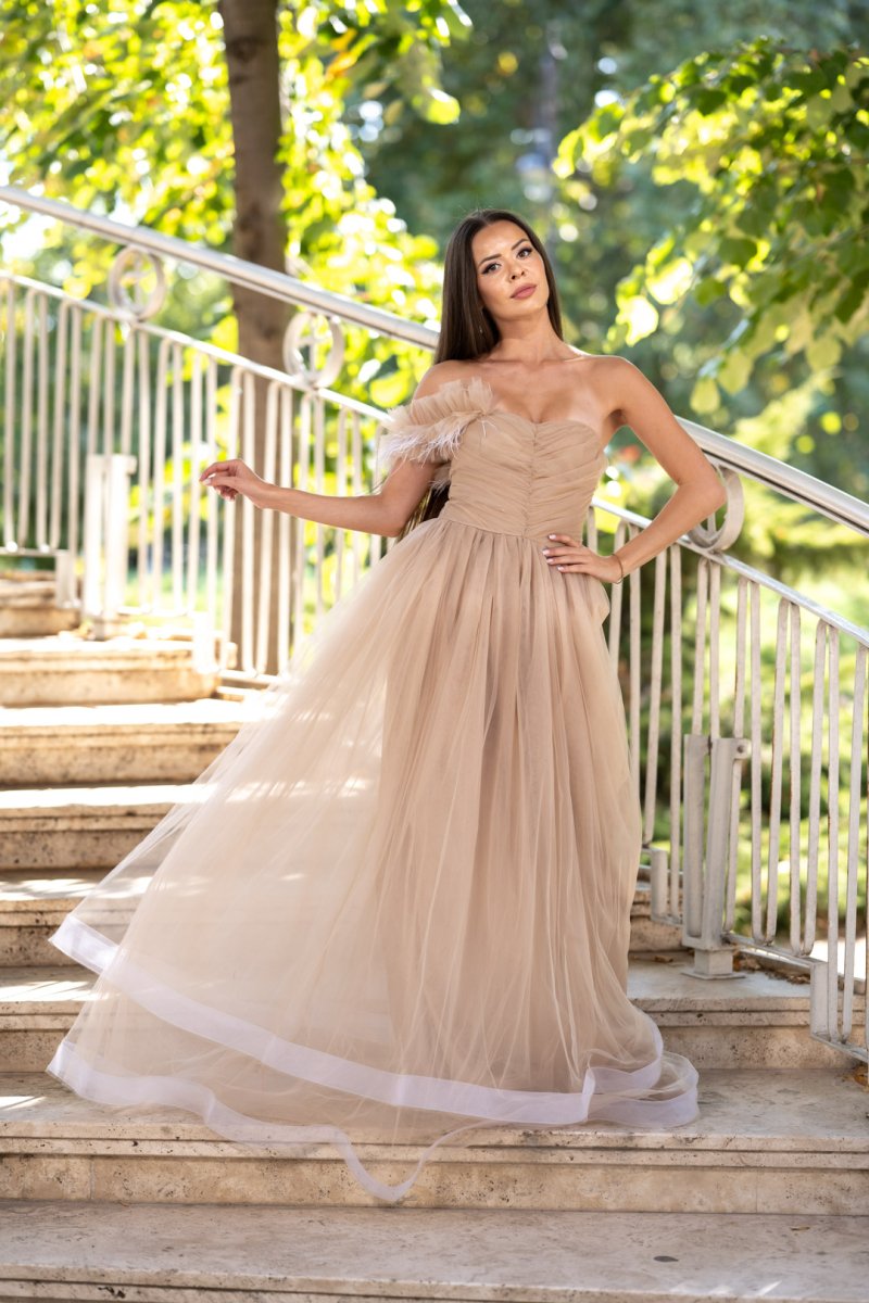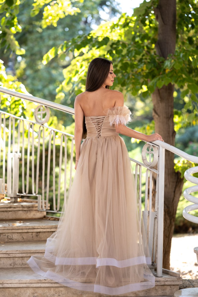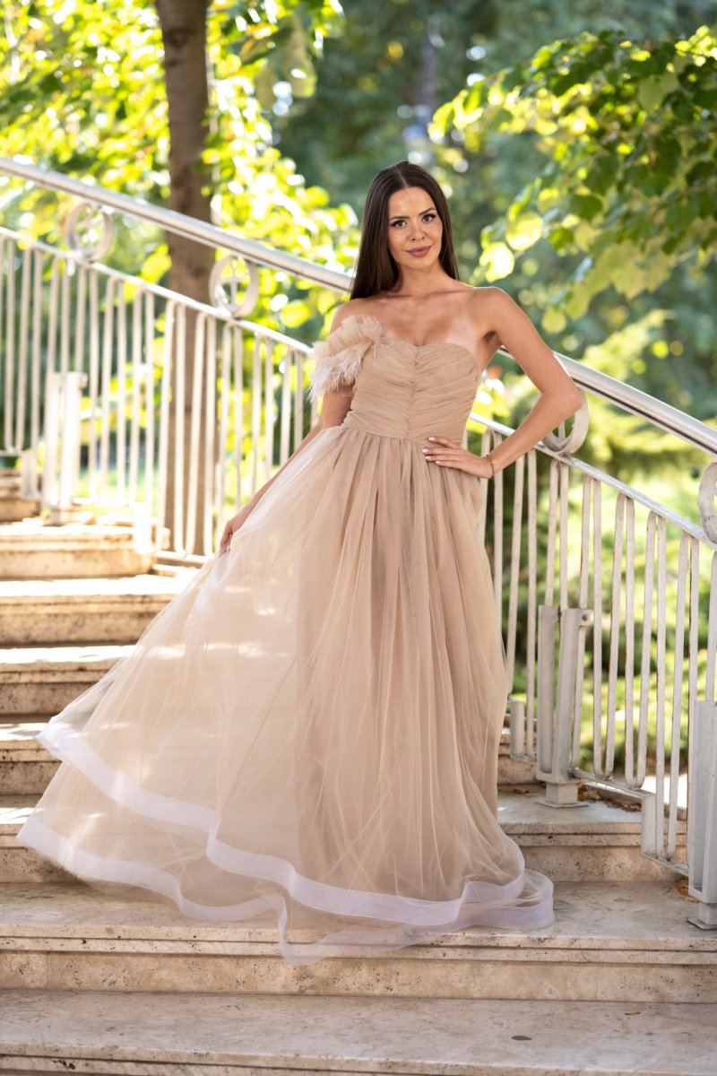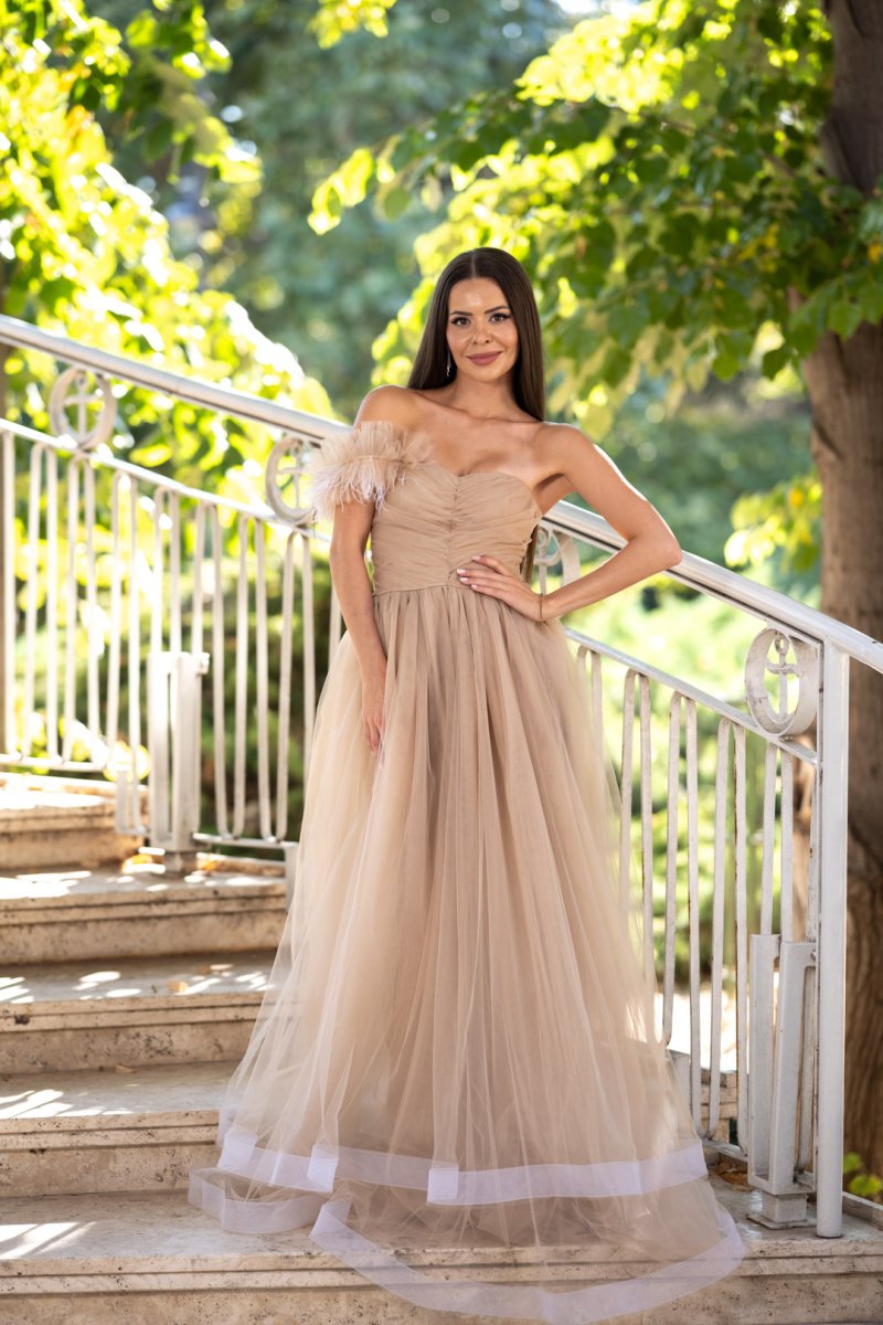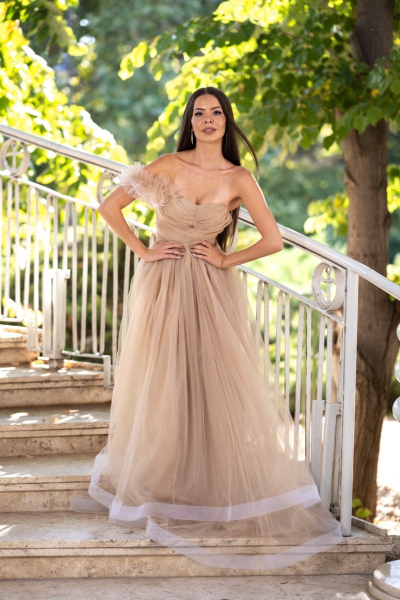 Меката линия на тюлените пластове създава ефирен силует, докато асиметричното рамо с пера внася артистичен акцент. Корсетният гръб оформя талията и добавя усещане за индивидуална елегантност. Това е рокля, създадена за жени, които искат да се почувстват като кралици.