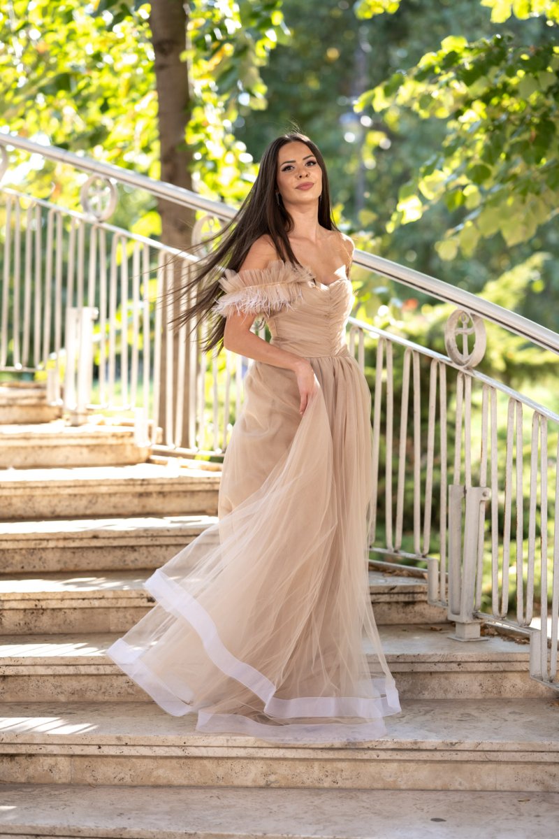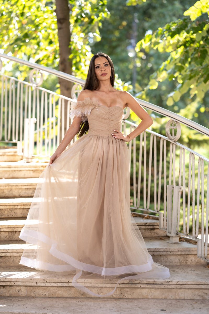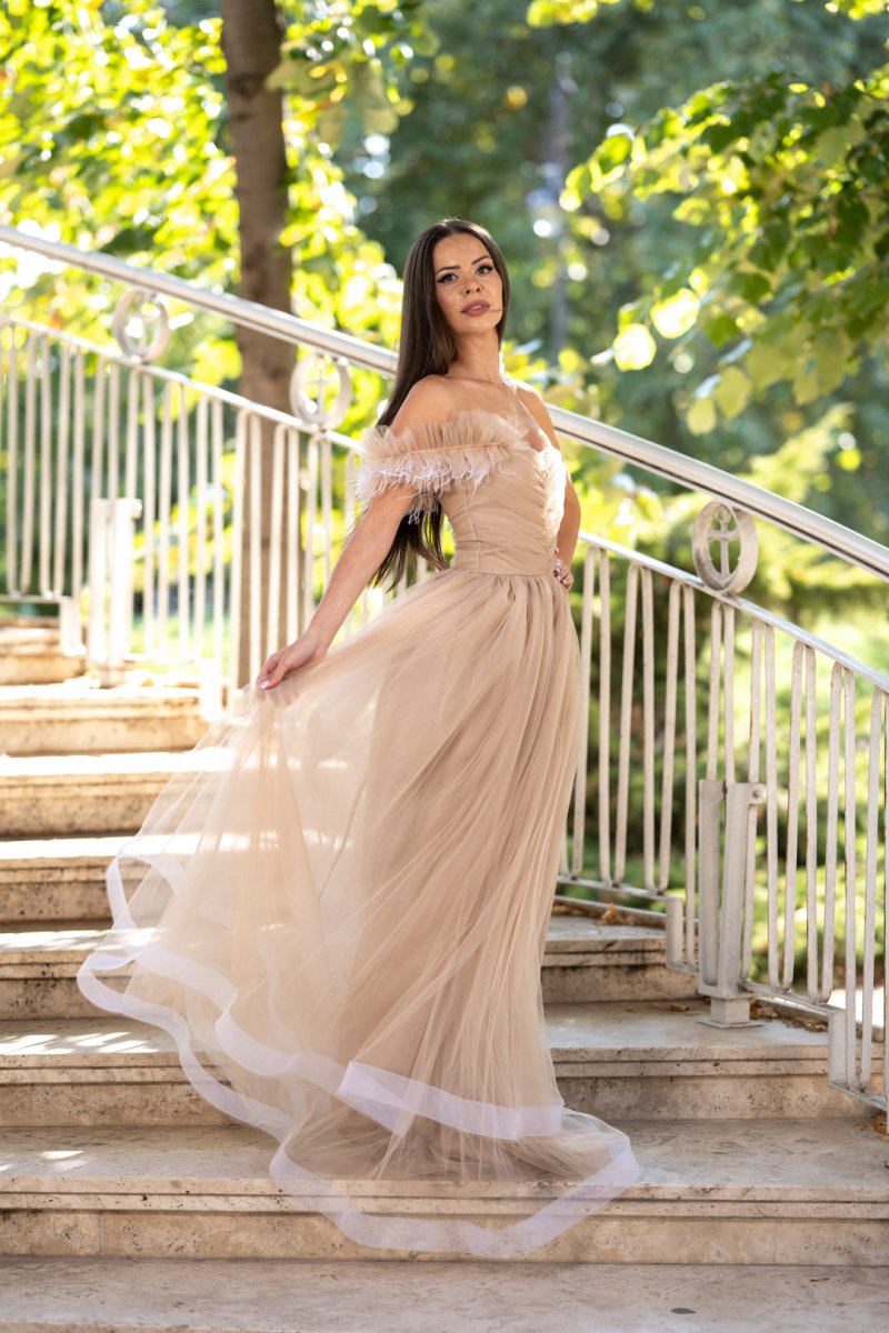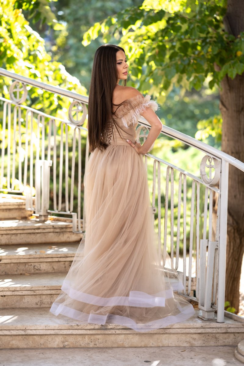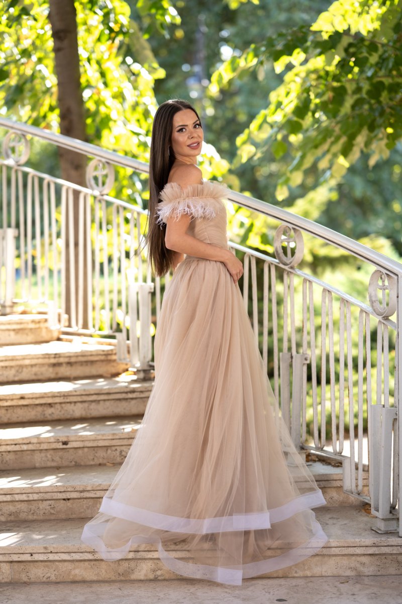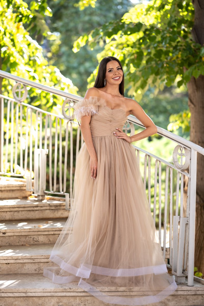 Меката линия на тюлените пластове създава ефирен силует, докато асиметричното рамо с пера внася артистичен акцент. Корсетният гръб оформя талията и добавя усещане за индивидуална елегантност. Това е рокля, създадена за жени, които искат да се почувстват като кралици.