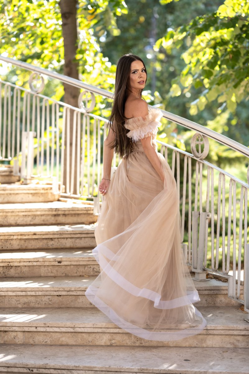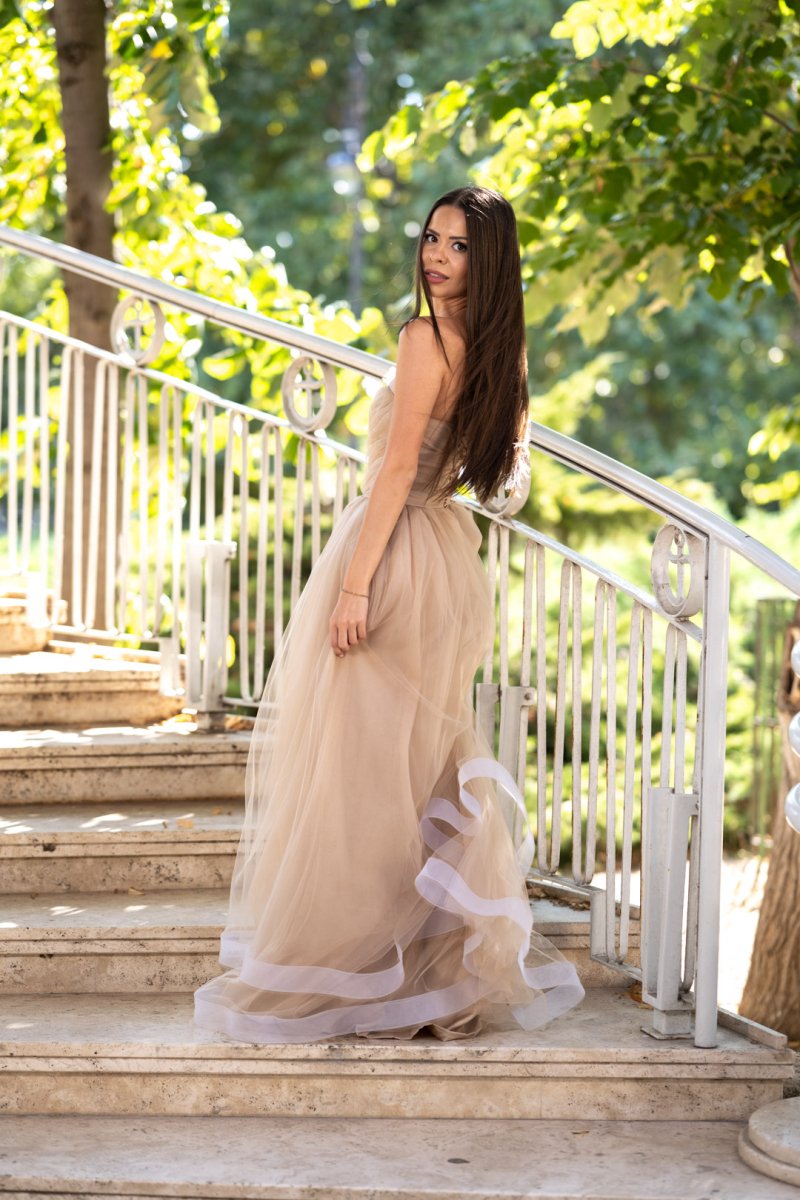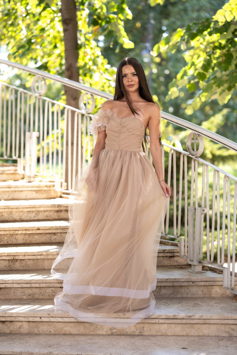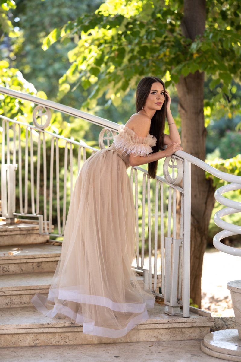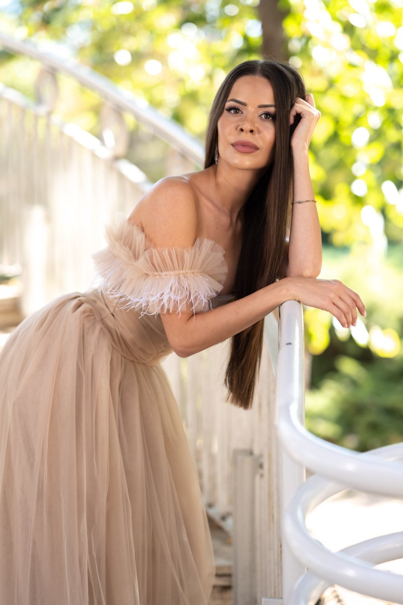 Меката линия на тюлените пластове създава ефирен силует, докато асиметричното рамо с пера внася артистичен акцент. Корсетният гръб оформя талията и добавя усещане за индивидуална елегантност. Това е рокля, създадена за жени, които искат да се почувстват като кралици.