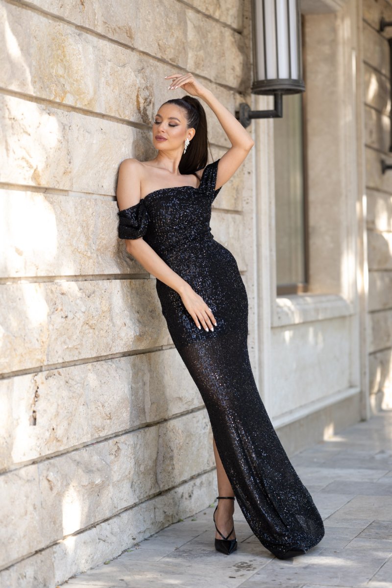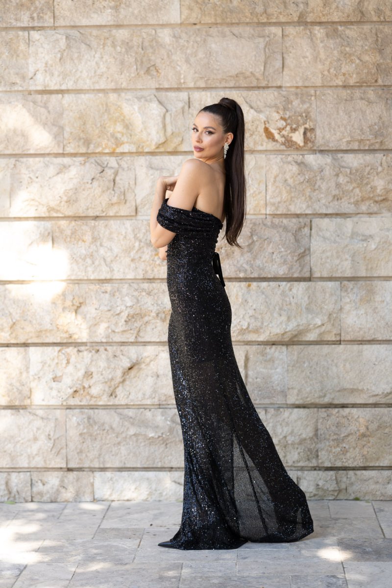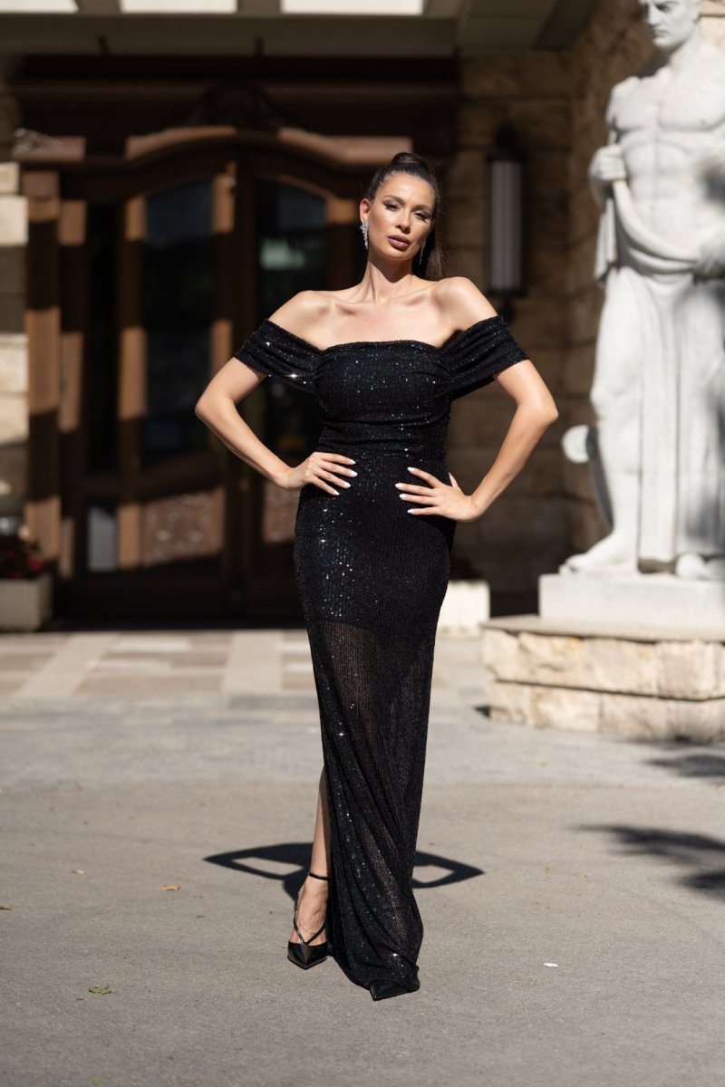 Излъчвай блясък и класа с тази изкусителна черна рокля от JNSecret. Моделът с паднали ръкави и корсетен гръб обгръща силуета със съвършена линия, докато пайетите улавят светлината и превръщат всяка твоя стъпка в магия. Дългата кройка с цепка добавя нотка дързост, която балансира романтиката на раменете и женствеността на формата.
